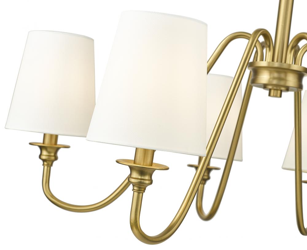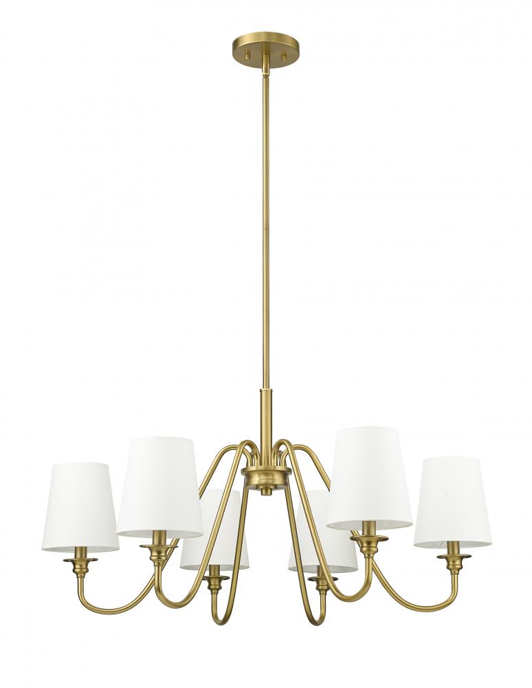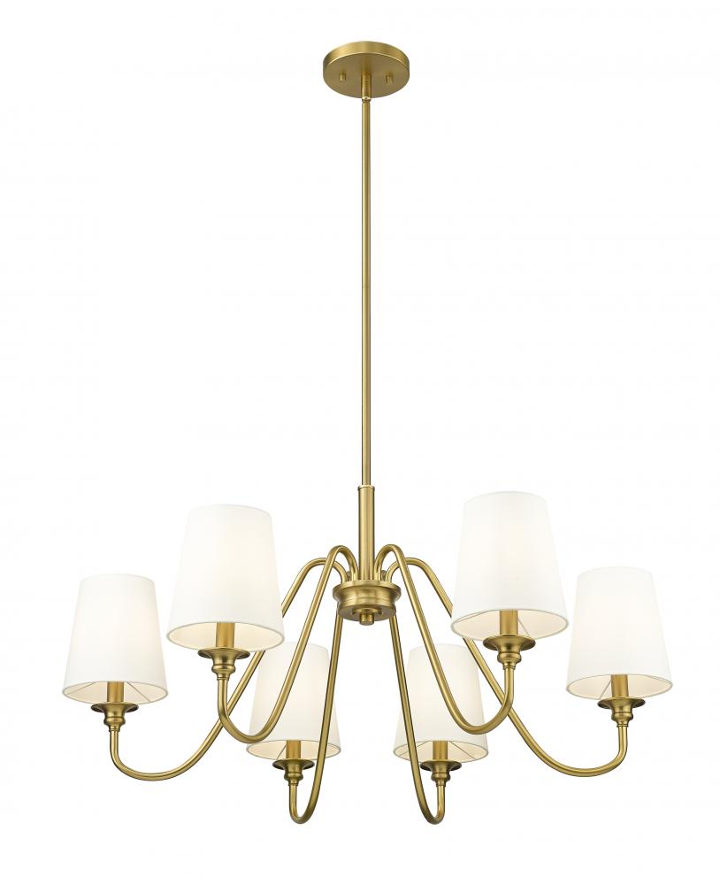 Simple, sweeping lines bring airy modernism to a chic six-light chandelier. Perfect for lighting a large foyer or dining room, it pairs a warm modern gold finish with opaque white shades, offering bright but diffused illumination that sets a refined ambiance.