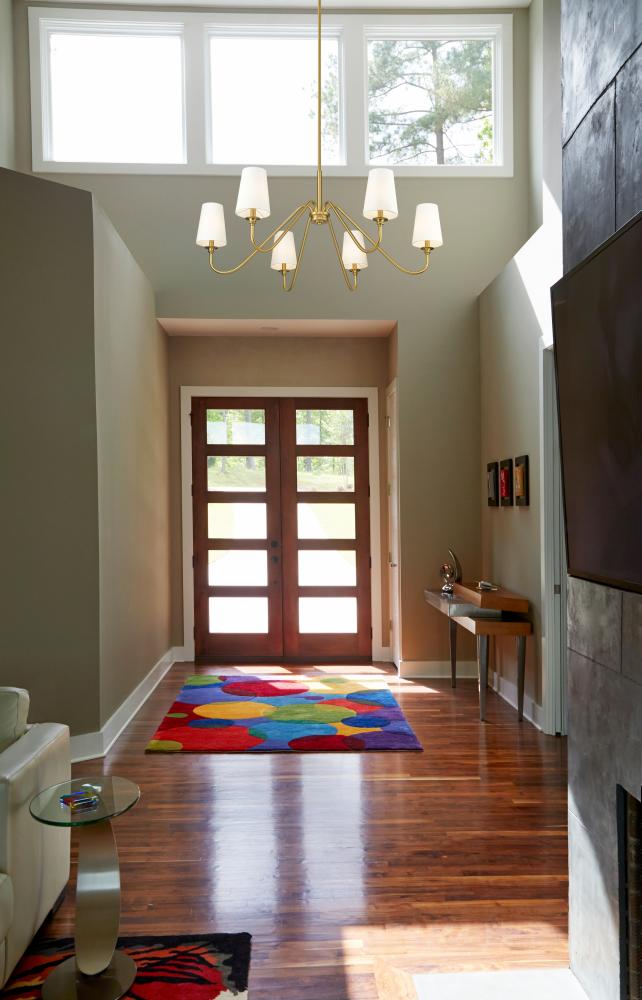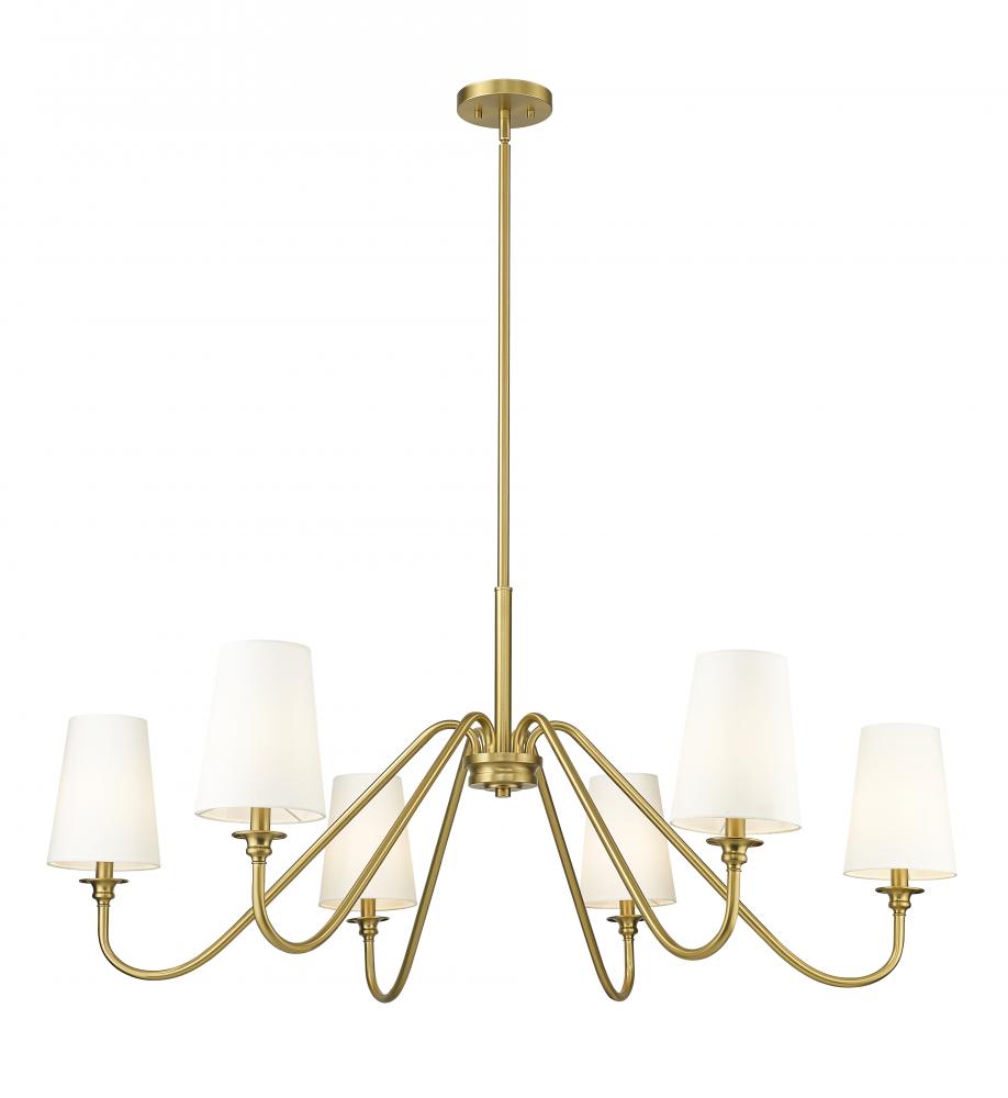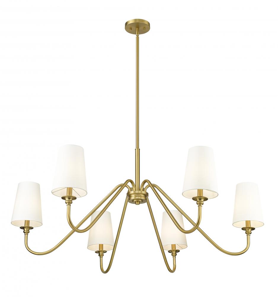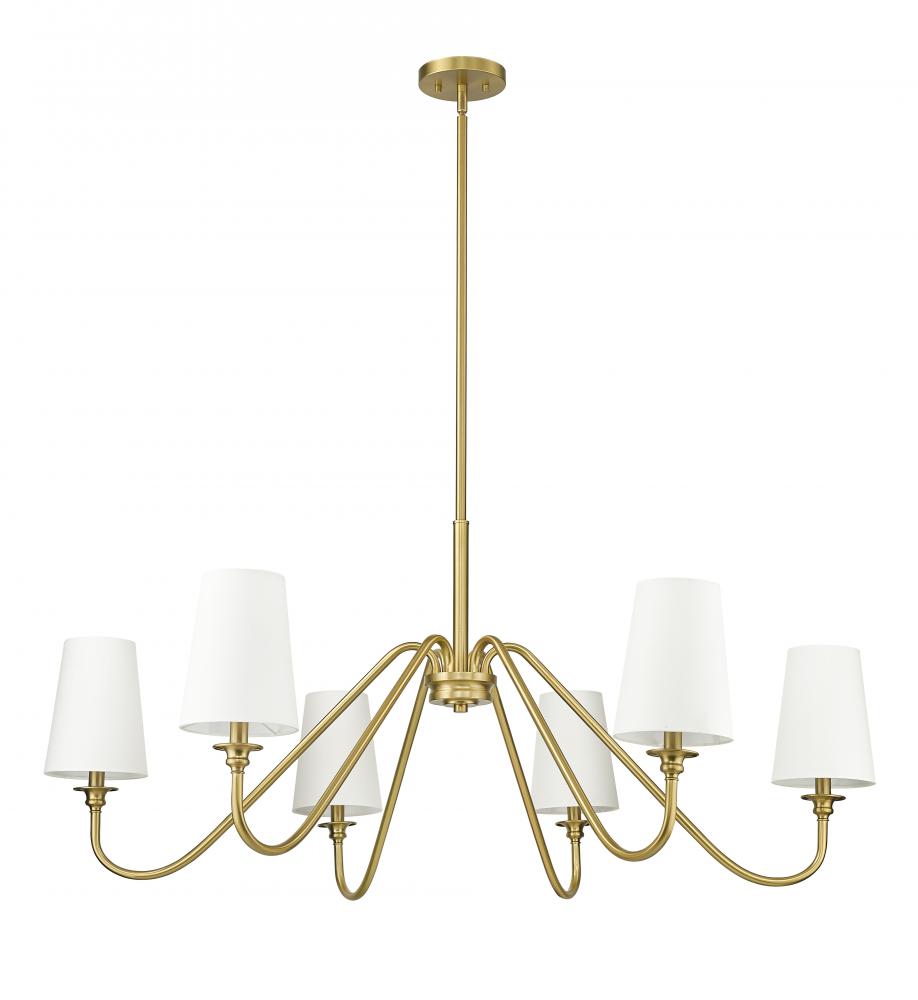 Modern simplicity sets the tone for the elegant Gianna six-light chandelier. In modern gold for statement-making presence, it showcases swooping arms and classic candlestick details that pair perfectly with opaque white shades for beautiful illumination. Airy design offers a refined touch in any setting, from your foyer to living or dining room.
