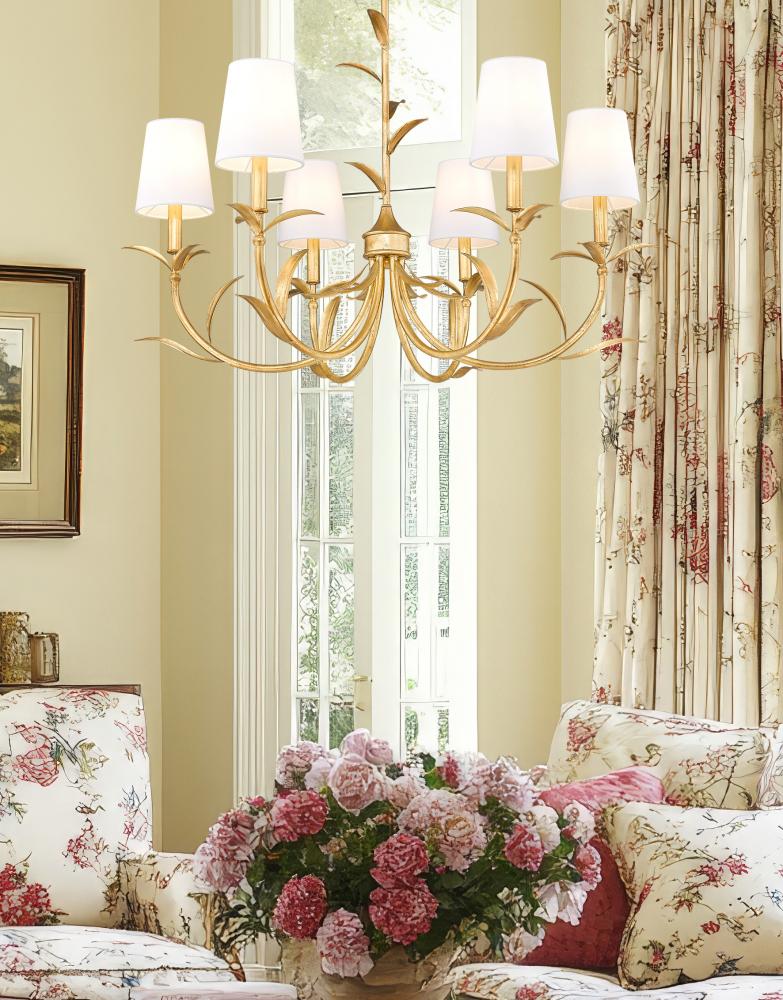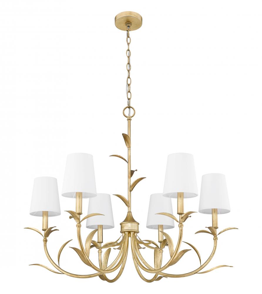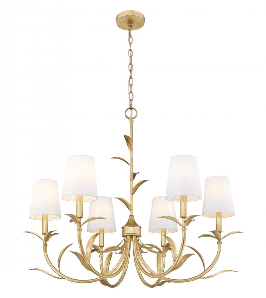 Fresh out of a mythical garden, the design of this six-light chandelier simulates the best in botanicals in its detailed gold leaf finish steel construction with softly curved arms and detailed shaped frond elements that reach up its rod suspension. A symmetrical silhouette creates beautiful, sophisticated style that embellishes dining rooms, bedrooms, and foyers with a gallery influence as well as dimmable lighting that delivers mood-inspired illumination.