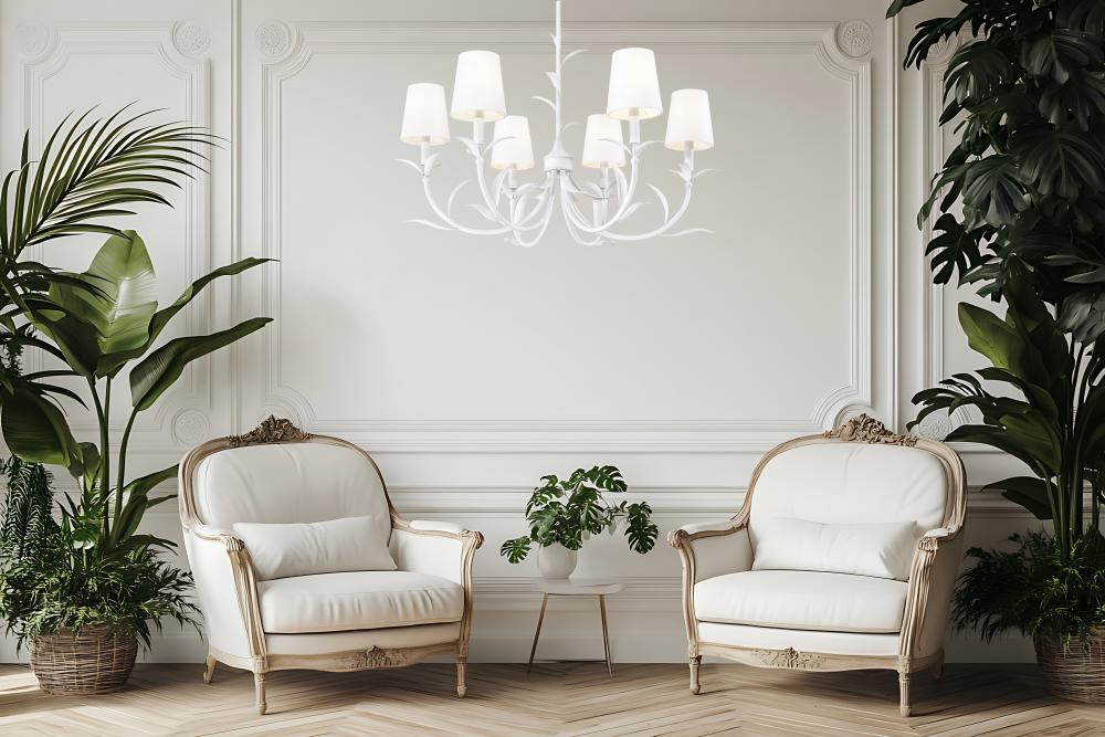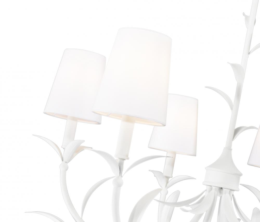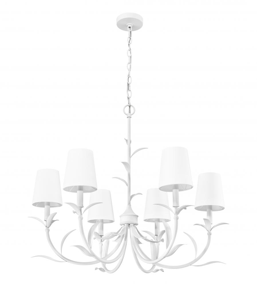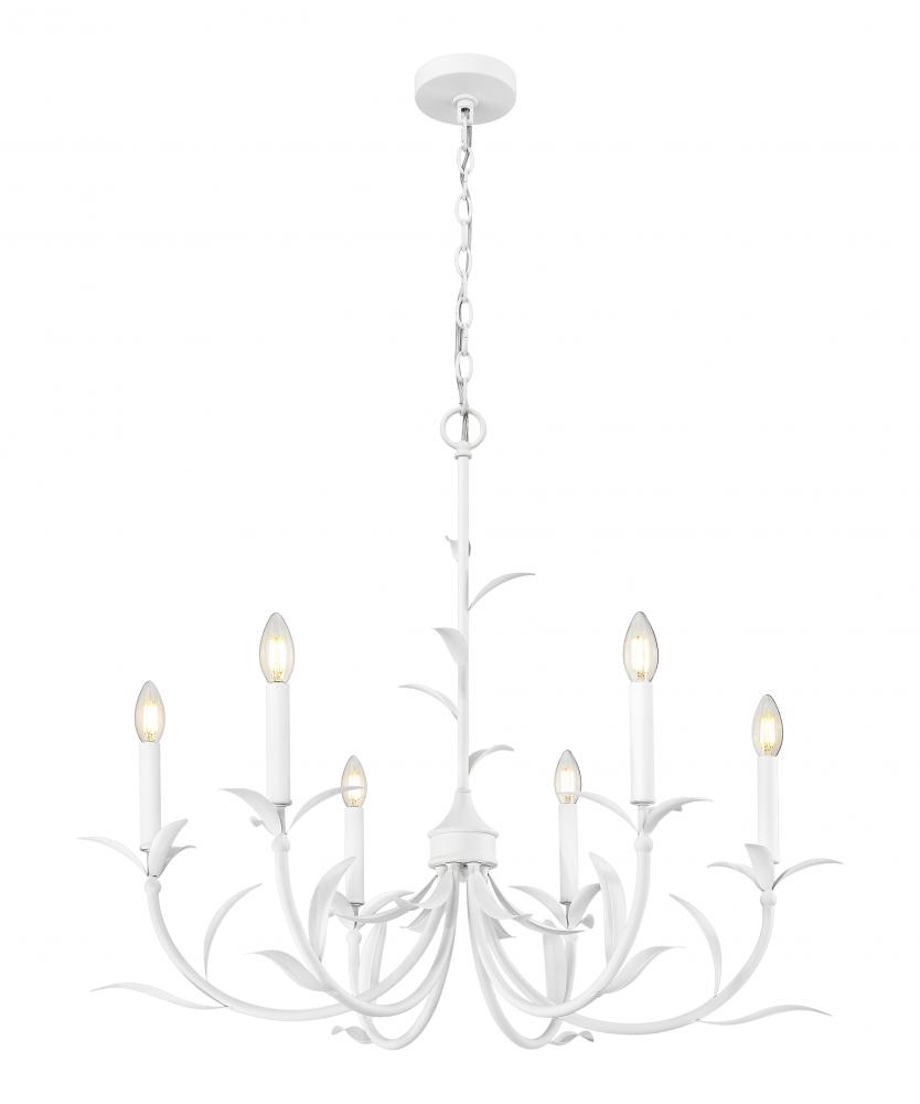 Soft textured white finish steel framing offers an elegant look to this six-light botanical chandelier, perfect for embracing a natural motif in dining rooms, foyers, and bedrooms. Curved arms with delicately shaped fronds invite a luxe look, with smooth holders and candelabra-style bulb mounts paving the way for dimming options that deliver mood lighting.