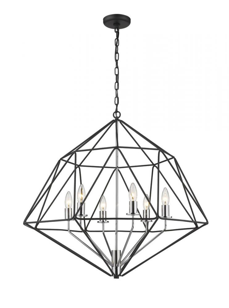 Fully energizing in its sleek geometric silhouette, this six-light chandelier delivers sophistication and contemporary verve in a modern living or dining space. Follow the angles of an open cage-like frame fashioned from two-tone finish metal in Matte Black and Chrome, and a dynamic architectural theme that offers mesmerizing effects.