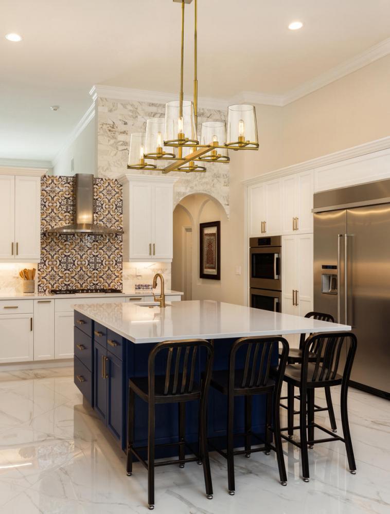 Sleek metal lines and a rich rubbed brass finish give this steel island light a sophisticated look. The design is enhanced by six clear glass shades to brighten any home with a luminous glow.