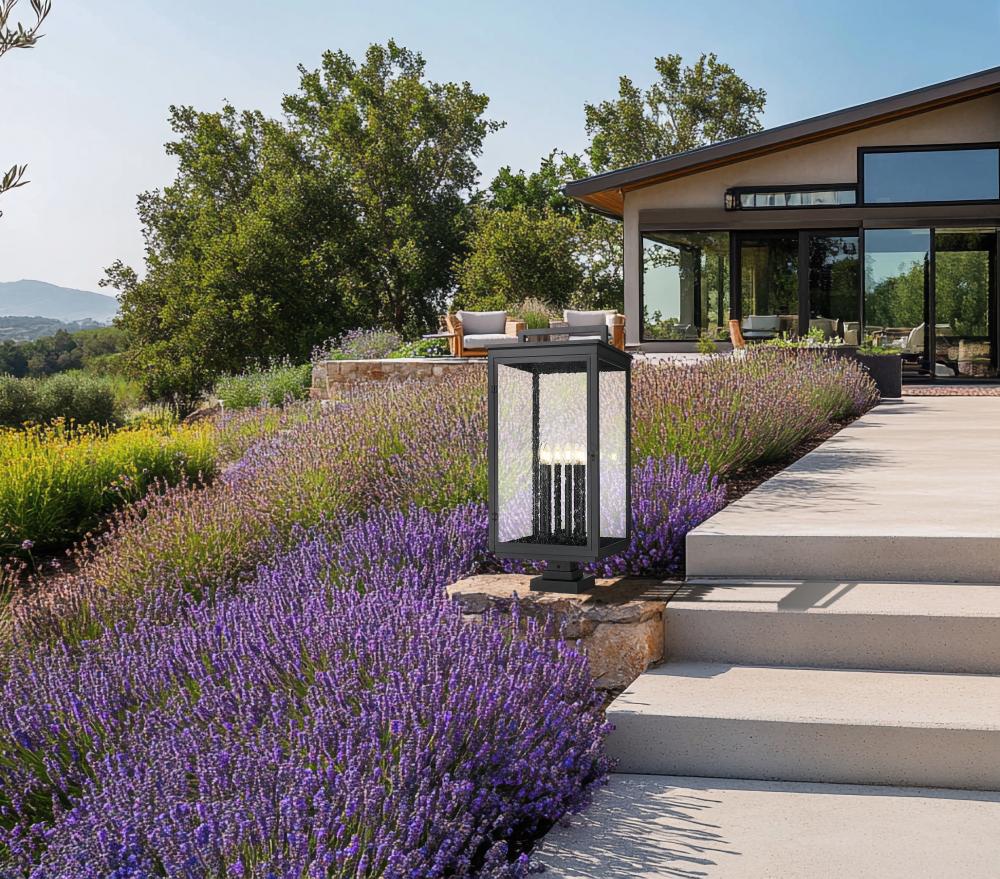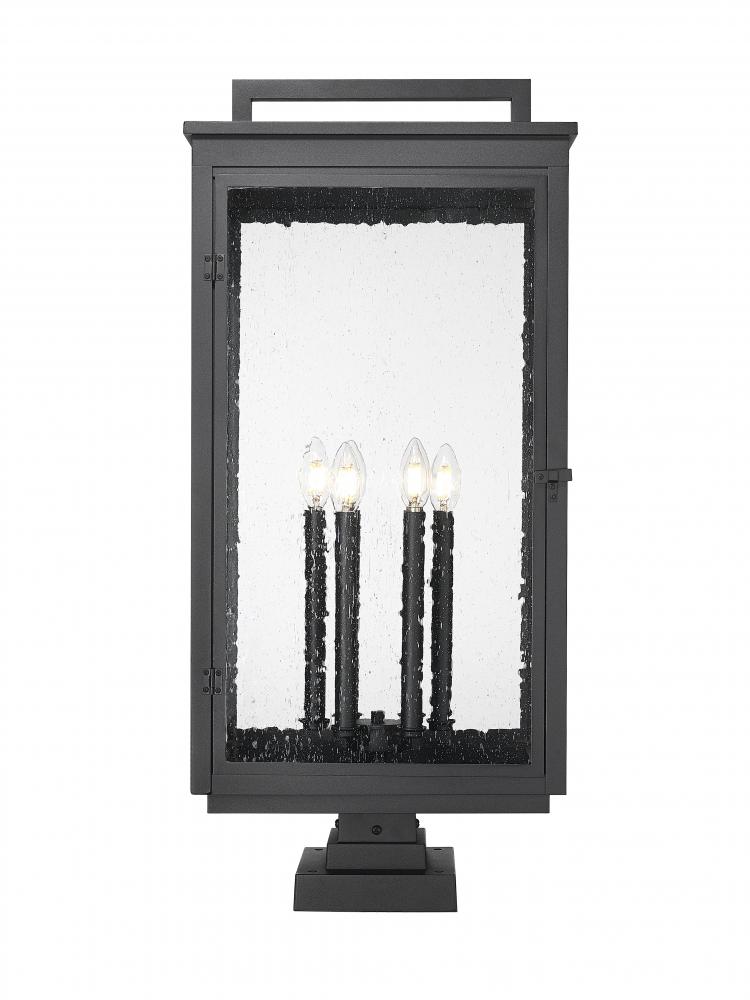 A decorative handle adds the perfect dose of craftsman charm to this traditional Mission six-light outdoor pier mount fixture. Clear seedy glass panes allow full view of the candelabra cluster of lights tucked within, offering plenty of depth and dimensionality. Its aluminum frame receives a marine-grade sand black finish with subtle texture, perfect for curb appeal that stands the test of time.