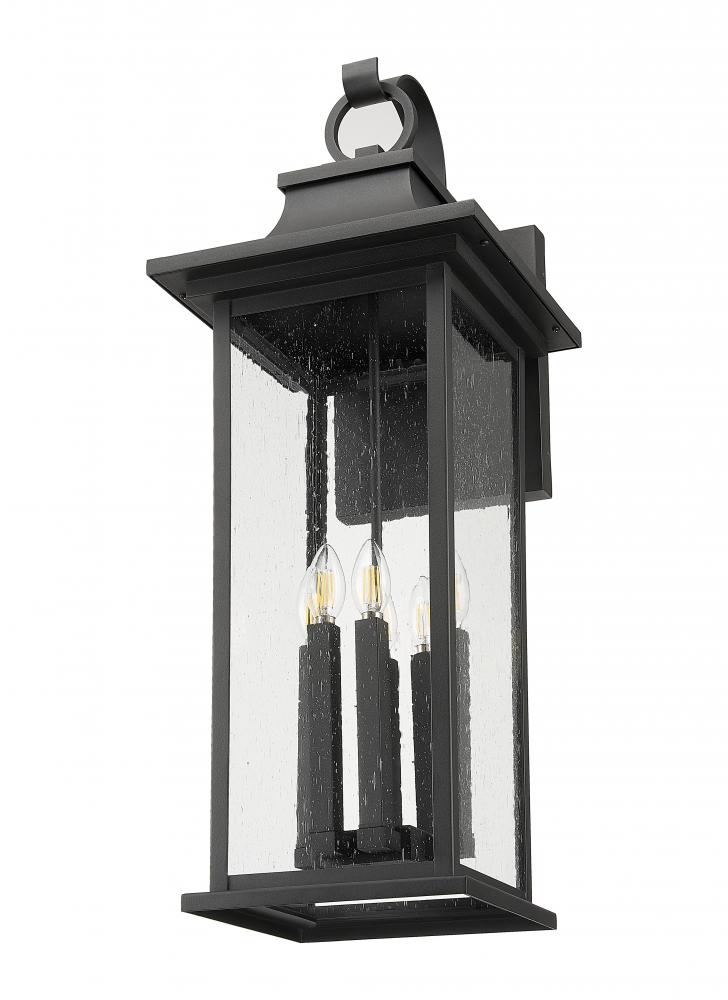 A coastal black finish stands up to the elements to create durability for this transitional six-light outdoor wall light. Perfect for porch or patio, it features a classic lantern silhouette with clean, straight lines and clear seedy glass panels. The fixture is complete with a scrolled arm and ring finial topping with a flared cap that offers plenty of decorative appeal.