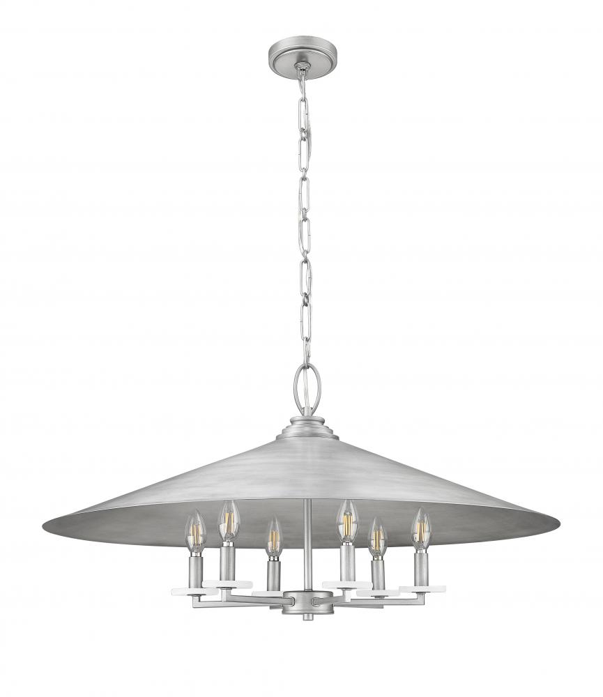 A signature pewter finish lends aged authenticity and cool ambiance to this industrial six-light pendant. Its familiar conical shade silhouette is complemented with the organic character of alabaster bobeches, and the fixture includes three finishes of candle sleeves for the perfect look on every occasion.