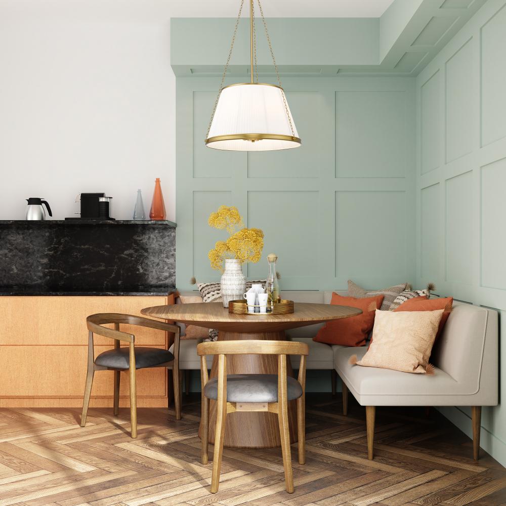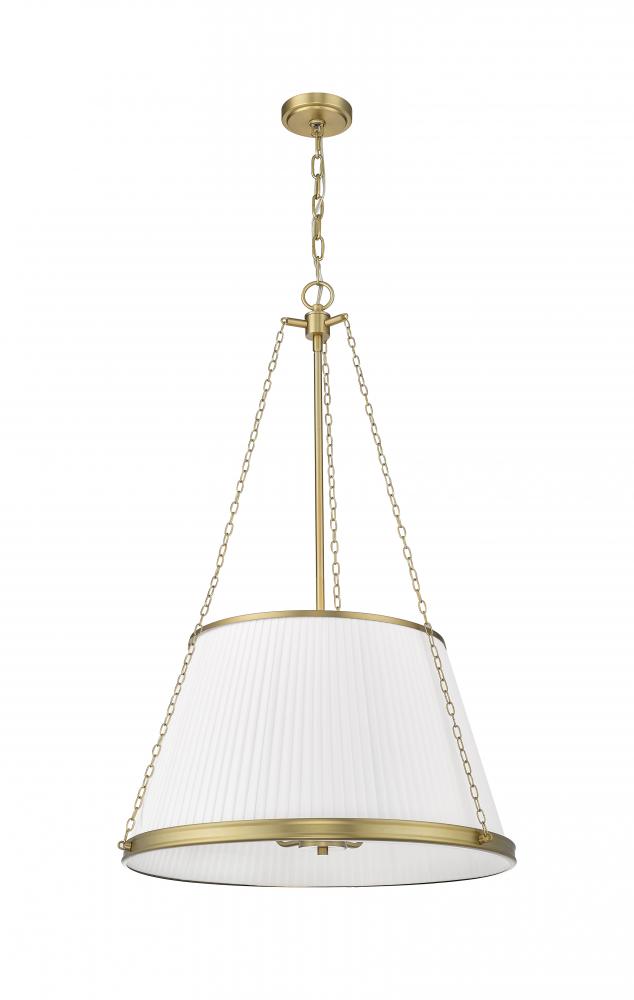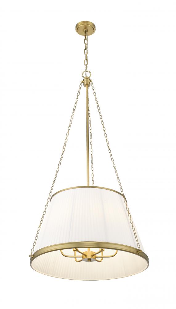 Inviting details bring lively flair to a modern six-light pendant. Its pleated linen empire shade casts soft, glowing illumination over your living or dining space, while delicate chains offer fresh dimension and texture. The fixture is complete with a rich modern gold finish that lends wonderful sophistication.