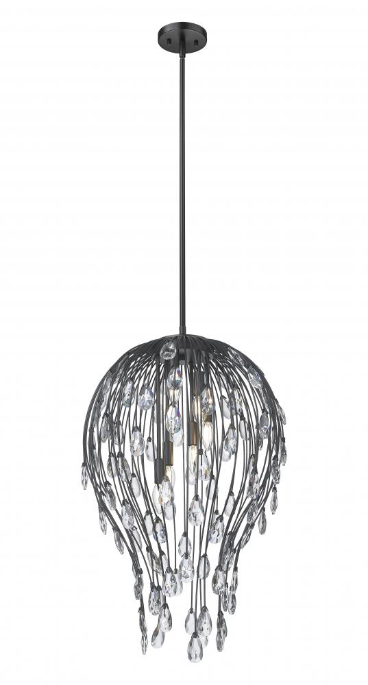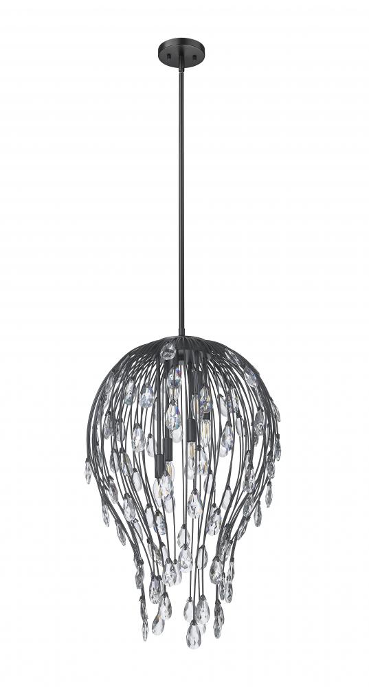 Embellish a chic room design with an artisan organic look in lighting. This six-light pendant delivers extra glam with its matte black open metalwork design contouring at its bottom, with shapely thin metal reed-like rods ending in bud icons made of radiant crystal. Chic botanicals add an earthy motif to a beautiful light fixture meant for living rooms, bedrooms, dining spaces, and entryways.