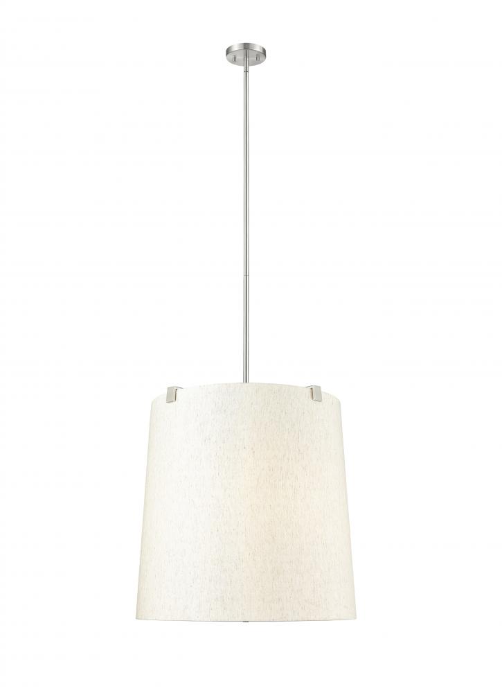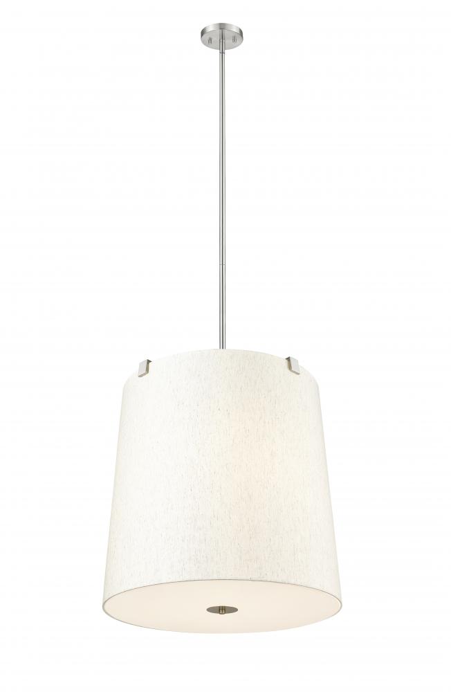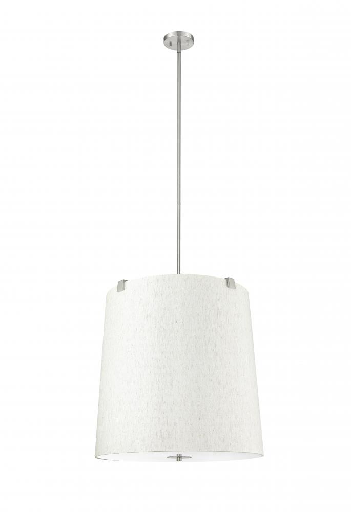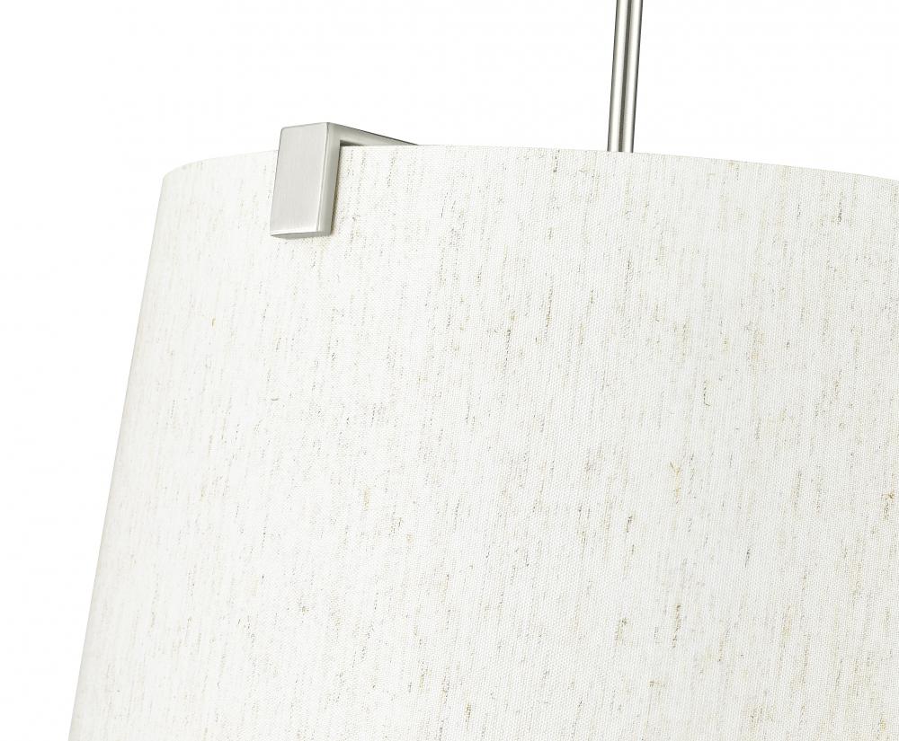 Retain the classic look of traditional lighting design with updated elements and a stylish flavor. This six-light pendant highlights islands or living spaces with a low-profile look, blending cool brushed nickel finish steel framing and accent clips to a cream fabric shade, as candelabra lights filter through the diffused shade. This dimmable fixture offers variable lighting levels to suit different spaces.