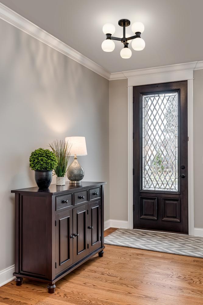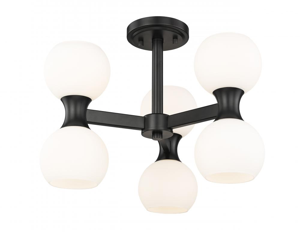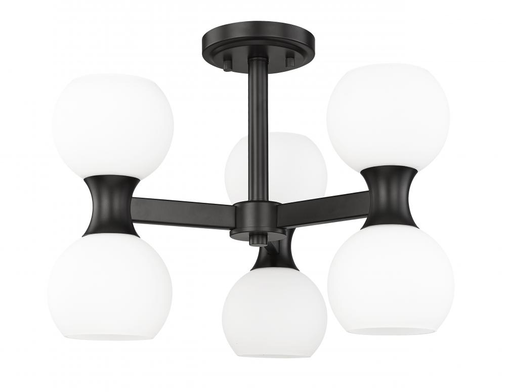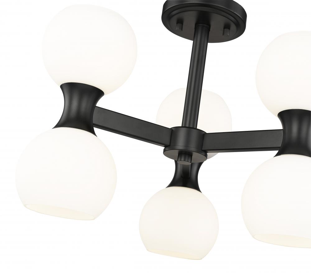 The striking contrast of matte black metal finish and delicate matte opal glass plays out in real time with a light fixture created for impact. This six-light semi-flush mount ceiling light from the Artemis collection draws attention whether placed in a kitchen, dining room, or foyer. Alluring convex curvatures play into an Art Deco theme with a distinct Mid-Century Modern flavor to repackage an iconic design scheme.