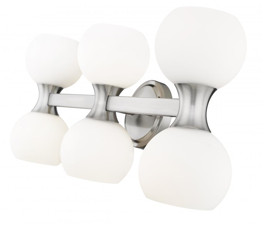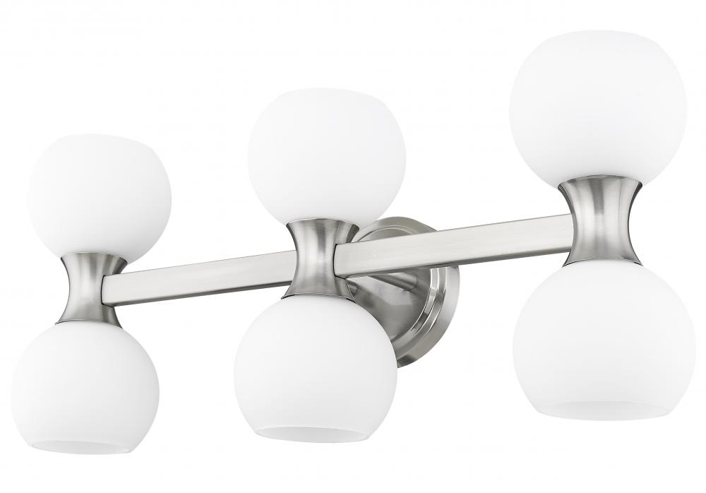 Symmetry and balance juxtaposed with subtle artful curves create an unforgettable Mid-Century Modern aesthetic in this six-light vanity light from the Artemis collection, a perfect choice for a casual bath space with upscale taste. Follow the delightful convex shapes of a chic brushed nickel finish steel frame and the delicate flavor of matte opal glass globe shades. Delivering both uplighting and downlighting, this vanity light brings solid illumination to an ensuite or guest bathroom.