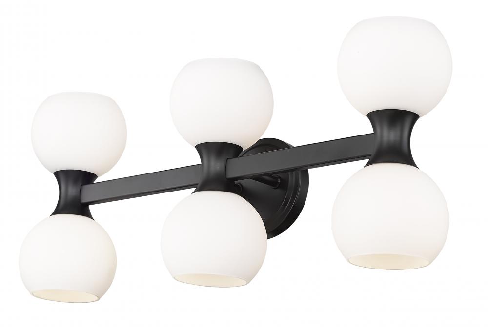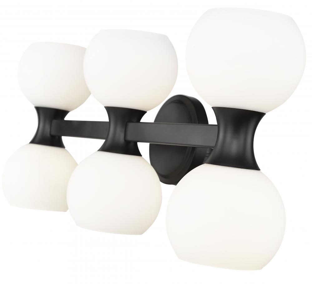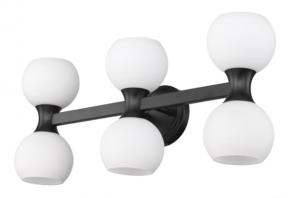 Spot the charming Mid-Century Modern aesthetic with subtle Art Deco style in a six-light bathroom vanity light from the Artemis collection. Follow the delightful convex shapes of a bold black finish steel frame and the delicate flavor of matte opal glass globe shades that form a notable contrasting palette with extra personality. Delivering both uplighting and downlighting, this vanity light brings solid illumination to an ensuite or guest bathroom.