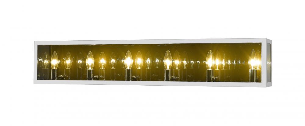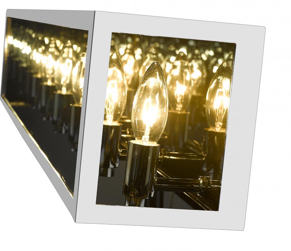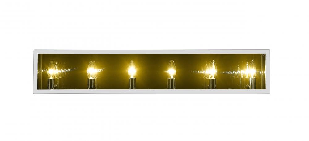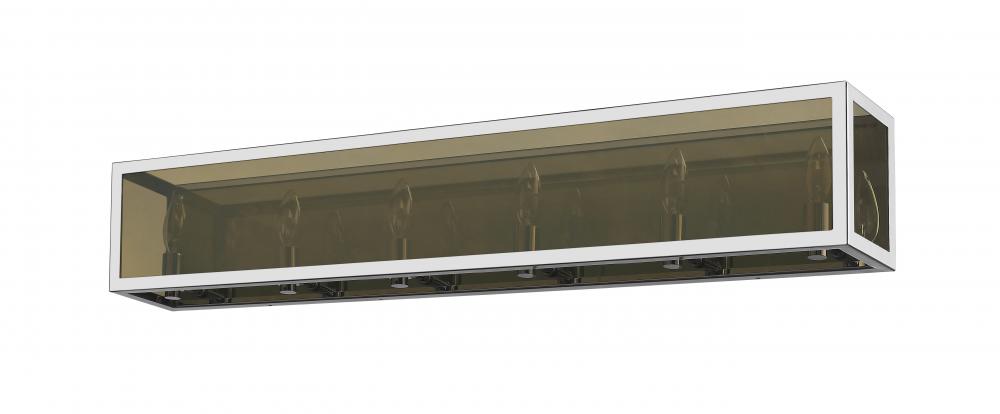 Choose this decadent contemporary six-light vanity light for its chic blend of steel and mirror, and a geometric linear silhouette that updates modern bathrooms. A double frame made from chrome finish steel joins both clear and smoke glass to deliver a soothing, atmospheric aesthetic with plenty of inspiration. Candelabra bulb mounts create an opportunity to change up the motif and fit into transitional spaces.