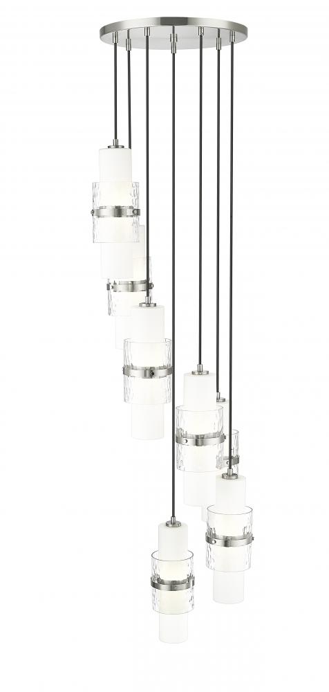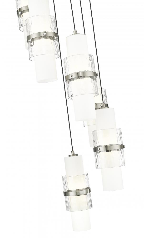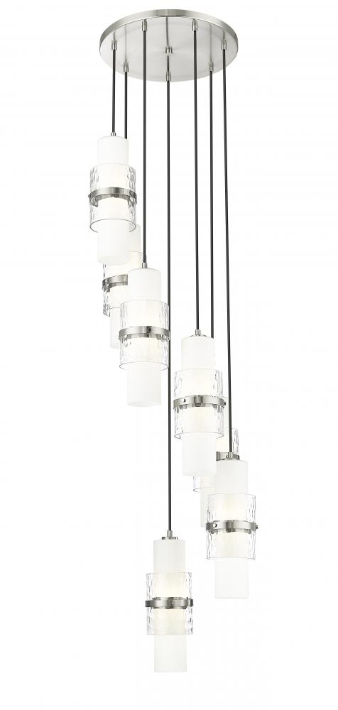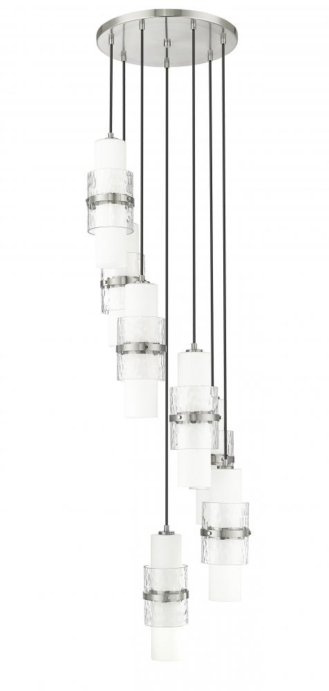 Cylindrical shades are arranged in a dizzying spiral to establish a superb silhouette for this modern seven-light chandelier. Perfect over a staircase or dining table, the chandelier features a brushed nickel finish canopy and decorative cuffs, which complement etched opal and clear textured glass cylinders that combine to create a stunning display.