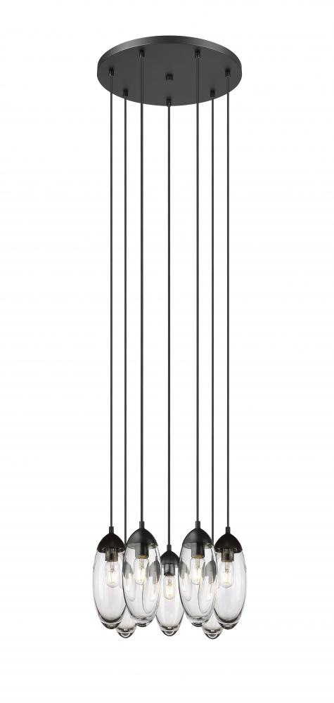 Decadence softened with minimalism becomes a natural choice in lighting as this seven-light round chandelier creates eye-catching beauty. Circular clustering of delicate glass teardrop shades and a bold matte black finish metal canopy form a minimalist silhouette with maximal impact, offering pure organic inspiration. Highlight a nook or reading space with this exquisite chandelier.
