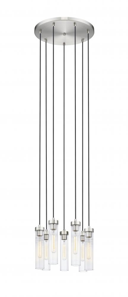 Dancing cylinders made of delicate glass create artistry and movement in a modern light fixture created as much for its glam-inspired design as for a flush of soft illumination. Choose this seven-light round chandelier for placement in a visible spot, showcasing its careful arrangement of dangling shades cascading from a cool brushed nickel finish metal canopy.