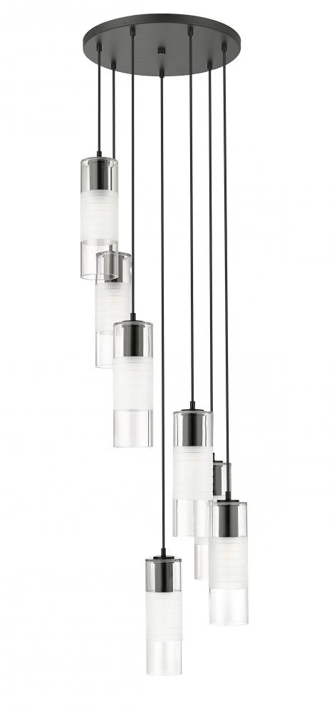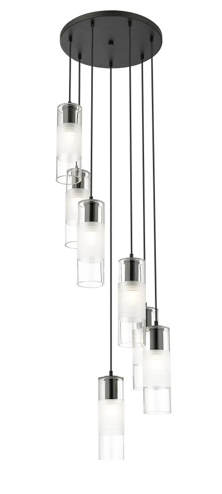 A simple spiral of lights creates a compelling silhouette for a modern seven-light chandelier. From the Alton collection, its a refined, substantial fixture, pairing artisan clear and d frosted shades with robust housings to create a sense of detail that enhances without overwhelming. A matte black finish is crisp and contemporary, beautiful over a welcoming foyer or dining table.