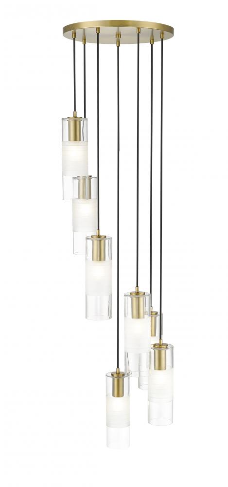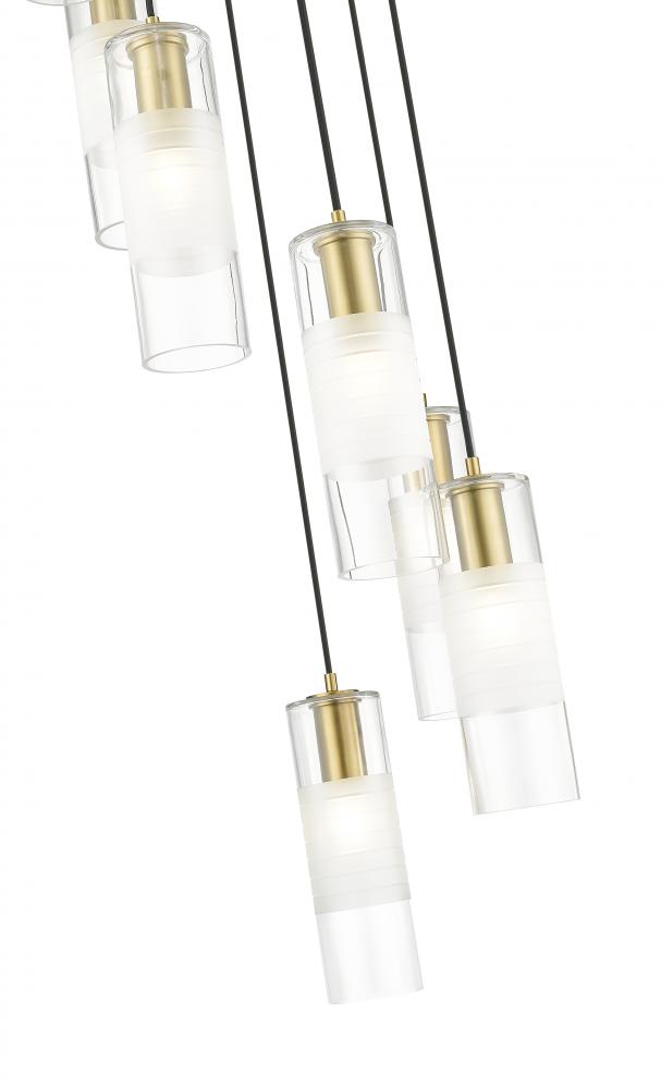 A simple spiral of lights creates a compelling silhouette for a modern seven-light chandelier. From the Alton collection, its a refined, substantial fixture, pairing artisan clear and d frosted shades with robust housings to create a sense of detail that enhances without overwhelming. A modern gold finish is warm and timeless, beautiful over a welcoming foyer or dining table.