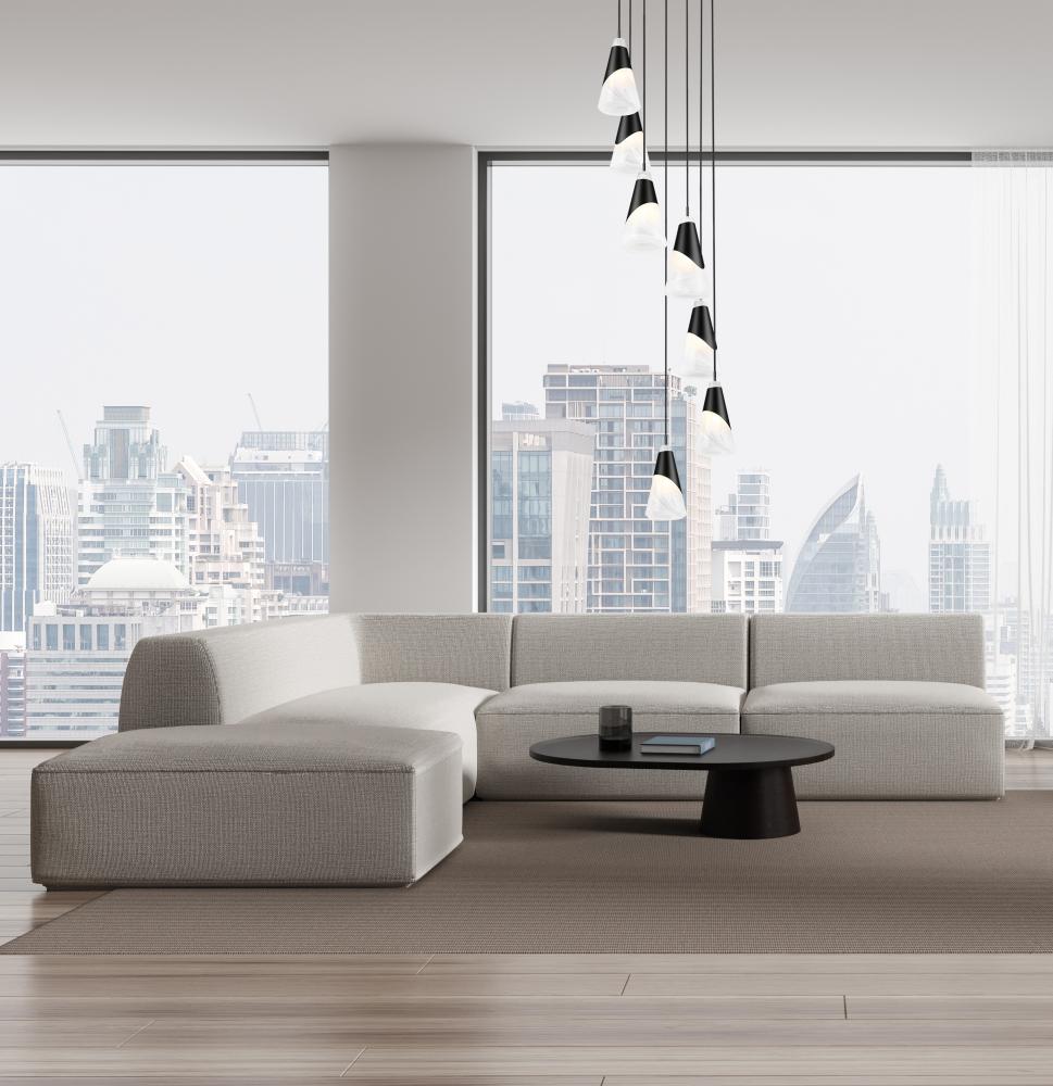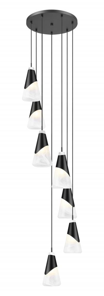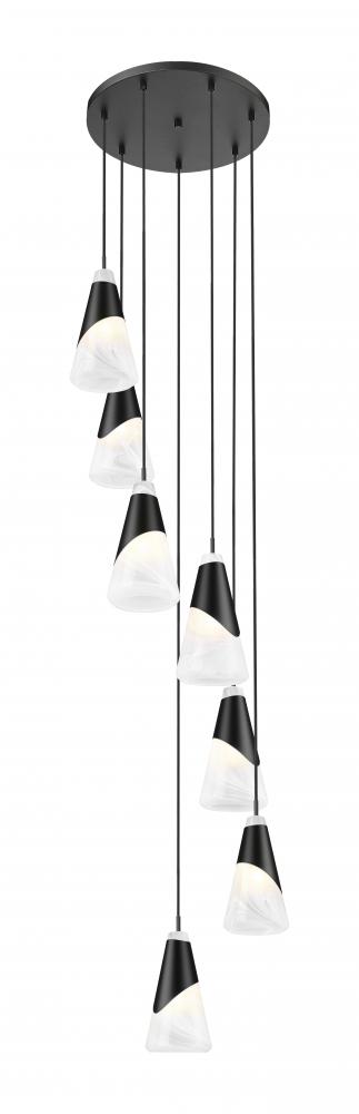The sophisticated contrast of light and dark is epitomized in this modern seven-light chandelier. Its round canopy suspends conical artisan glass shades, each with a chic swirled abstract pattern. A metal shroud in matte black surrounds each, creating a captivating sense of contrast and depth.