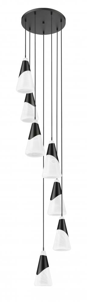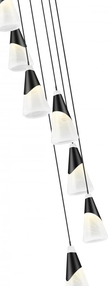 Cool sophistication radiates from a modern seven-light chandelier with a spiral silhouette that captures attention in any setting. The fixture showcases a black finish over its round canopy and metal shrouds, which add a sense of movement with fluid curves. Icy swirled artisan glass shades complete the design with refined flair and diffused illumination.
