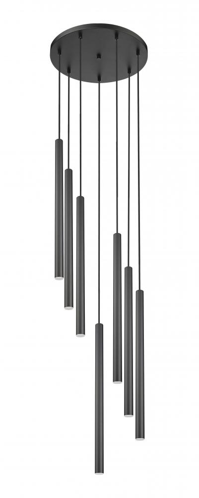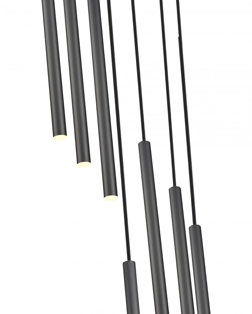 The instant drama of a spiraling fall of lights and a matte black finish highlight this modern seven-light chandelier. Featuring integrated LED lights, it delivers both energy efficiency and dimmable illumination thats perfect for living and dining rooms. Its slim shades create a compelling, almost sculptural silhouette are they spiral from a round canopy and bring beautiful illumination to your space.