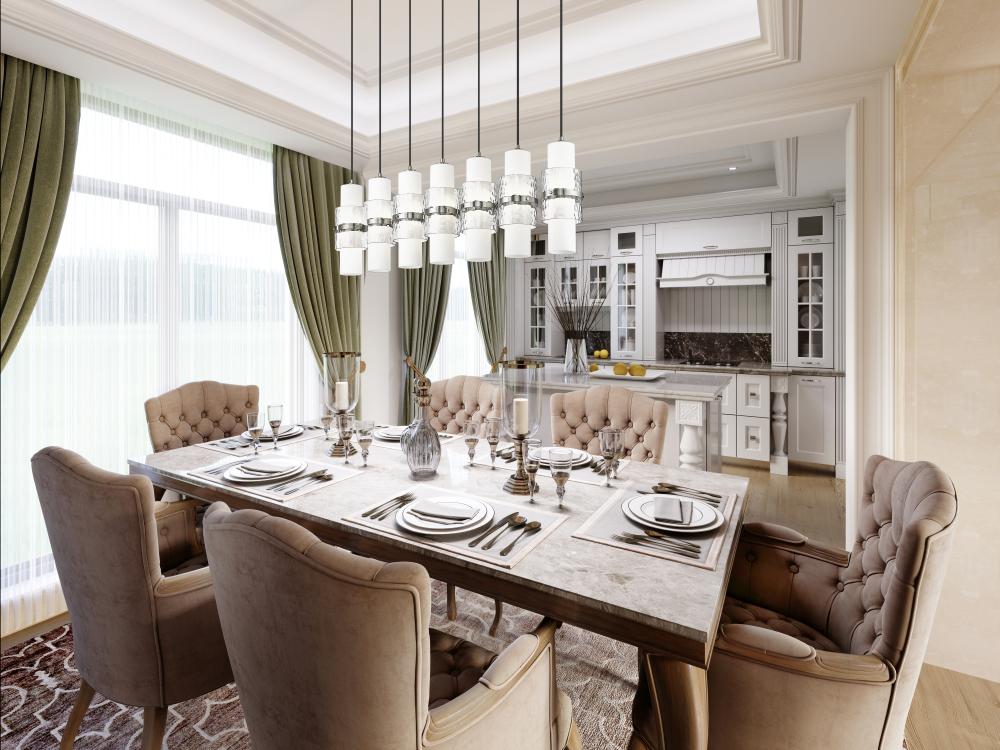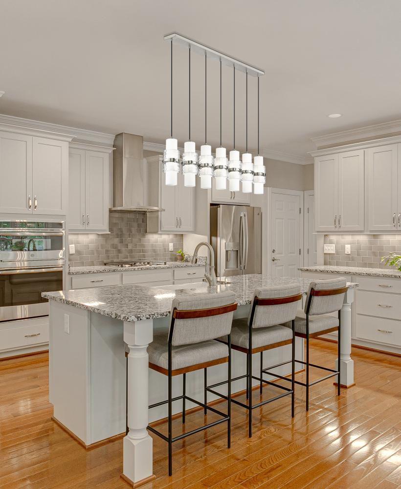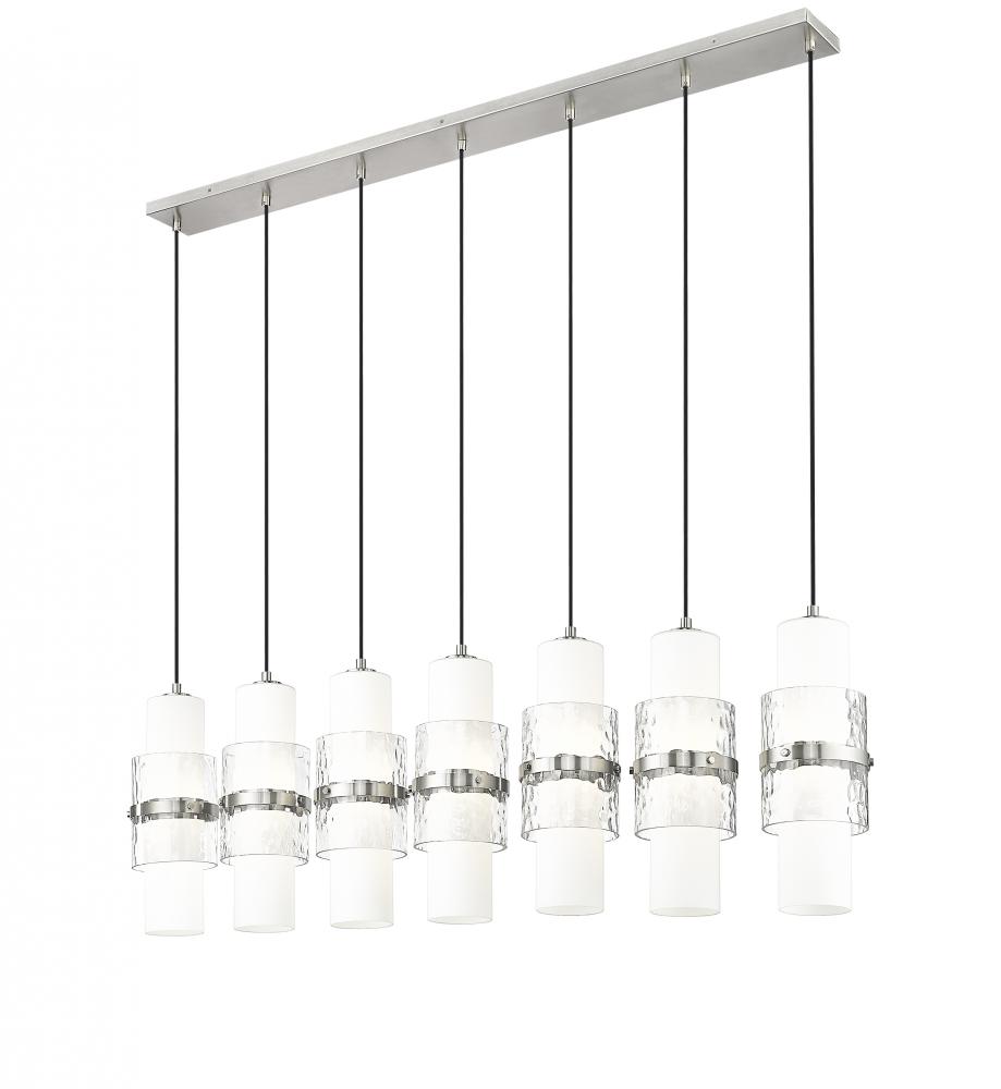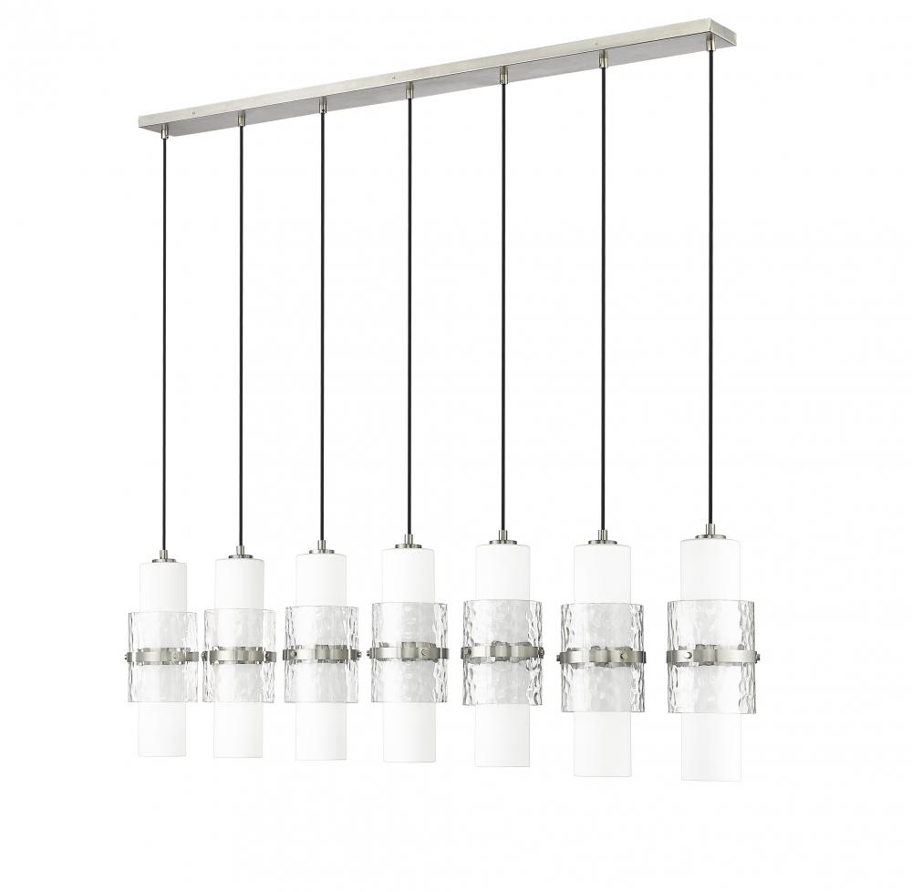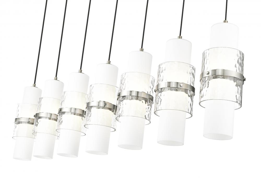 A modern seven-light island chandelier introduces sophisticated energy and elegance in an inviting kitchen. In a brushed nickel finish, it boasts a slim canopy and braided cloth covered cords, with a single row of delicate shades. Each features a center cylinder of etched opal glass complemented with clear textured glass that creates dimension and a metal cuff that adds artistry and elegance.