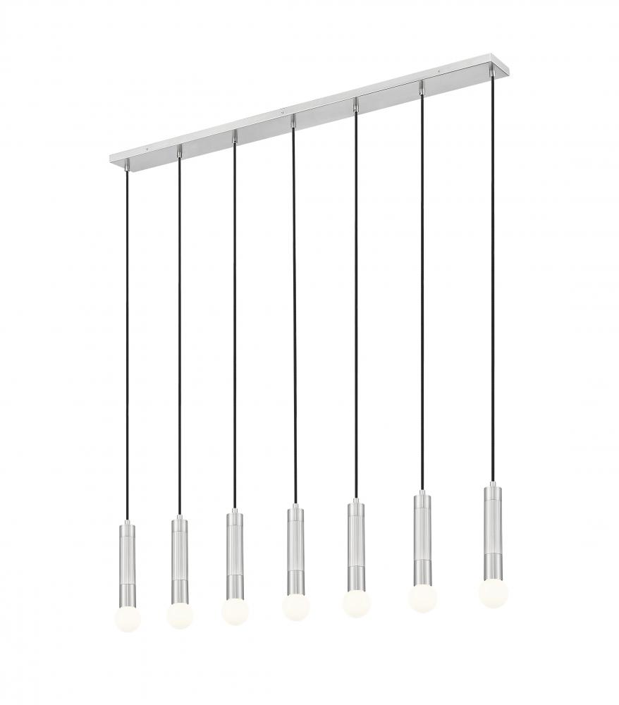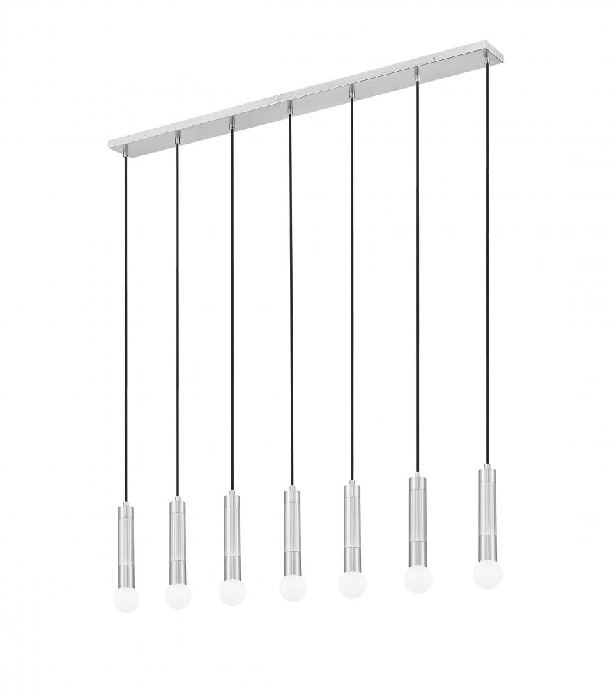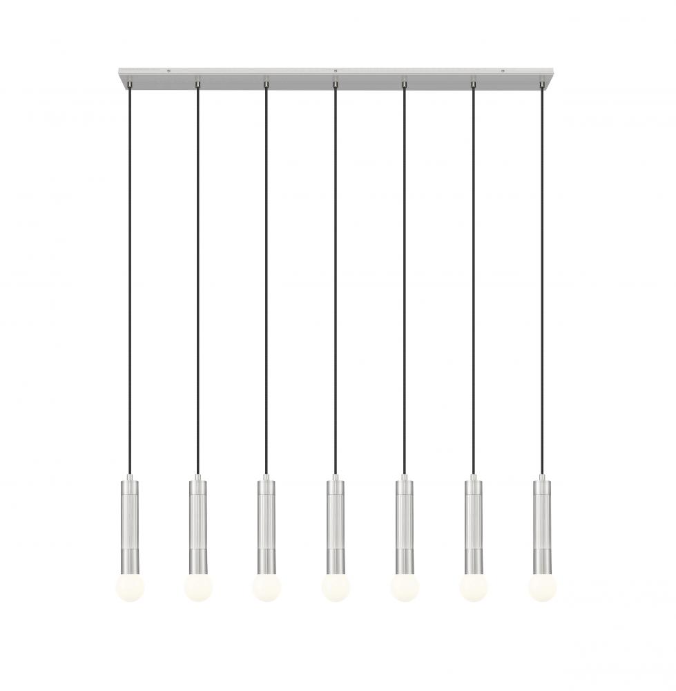 Clean simplicity infuses inviting style in a modern seven-light linear chandelier. In brushed nickel, its steel frame gleams in the light, offering versatile elegance over a kitchen island or dining table. The fixture pairs braided cords with elongated tubes and petite lights, creating bright, inviting illumination over your spaces.
