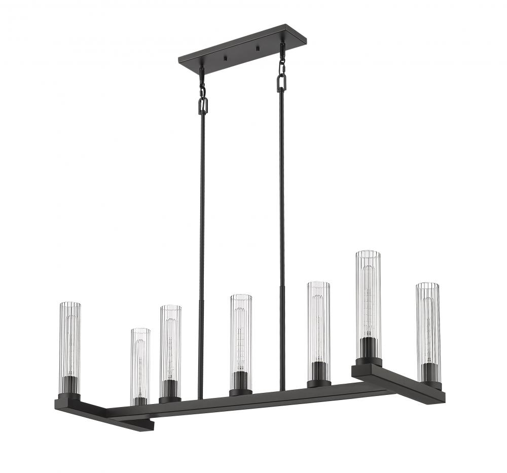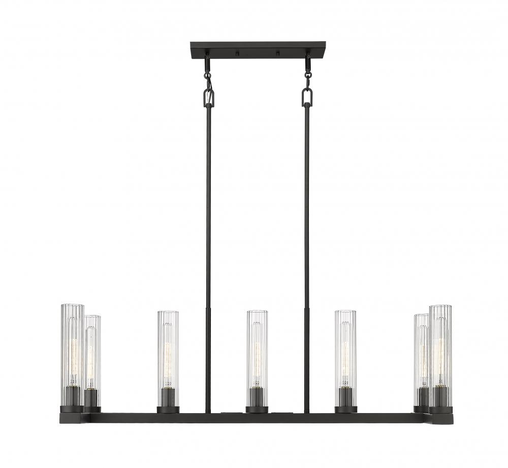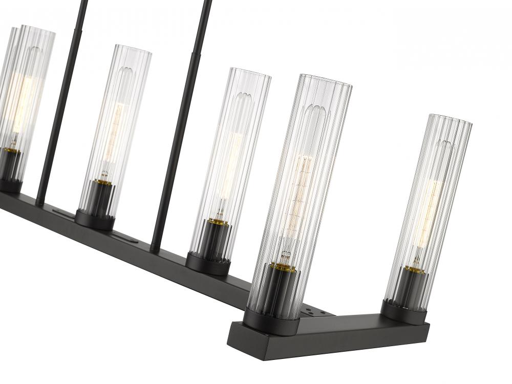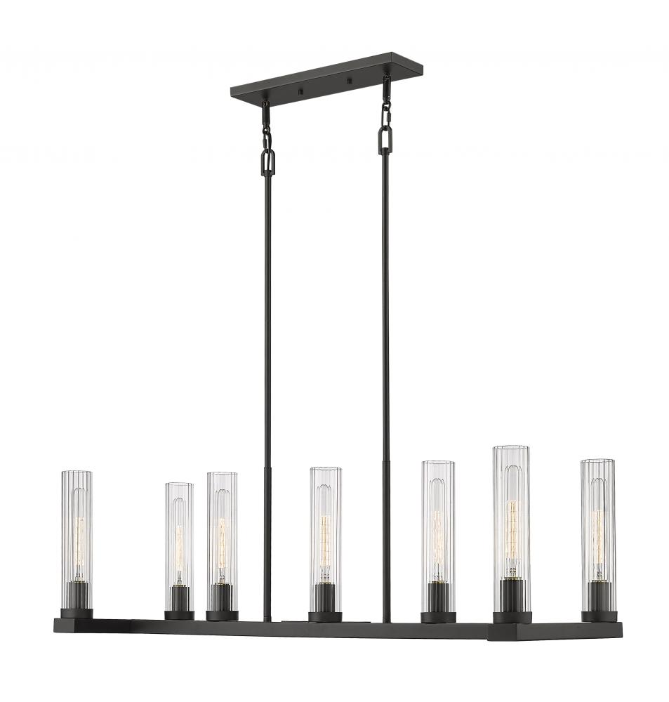 Clean geometric silhouetting flatters the Beau seven-light island/billiard light, an excellent option for adding ambient lighting in a transitional kitchen or entertaining space. This classic fixture offers a linear profile carefully arranging tall cylindrical fluted glass shades along a steel frame crafted of gleaming bronze finish steel. Suspension cords with industrial-inspired accenting brings a chic transitional quality to this sophisticated island/billiards light that adapts beautifully to entertaining spaces of all types.