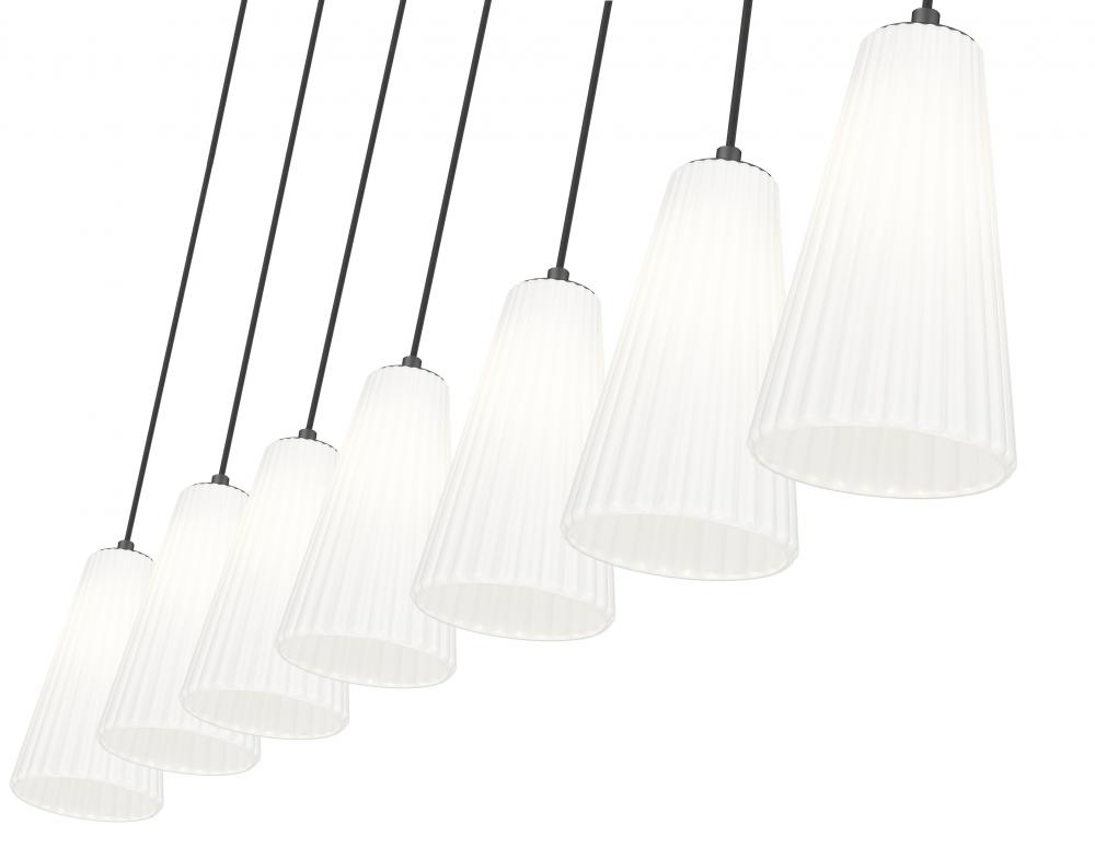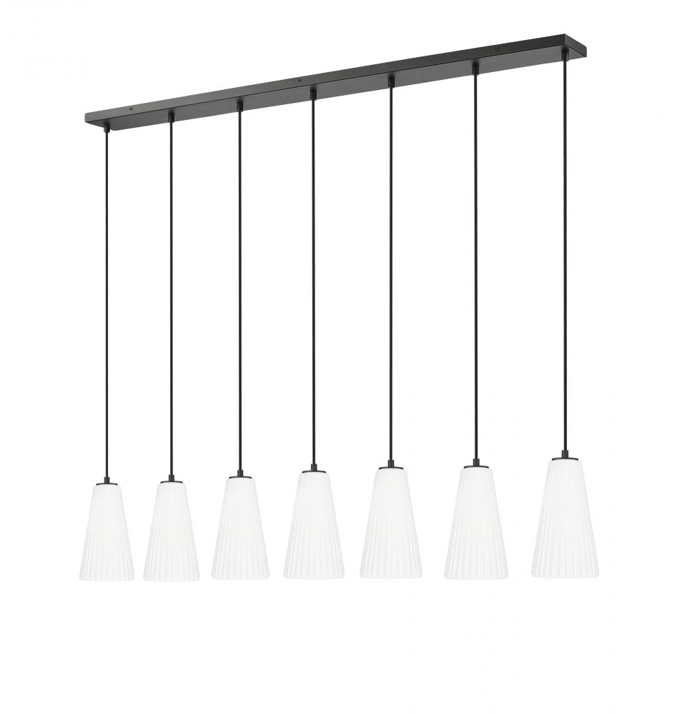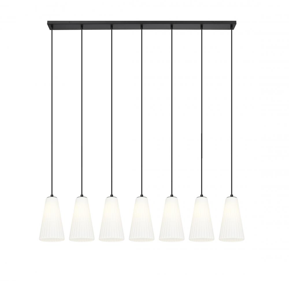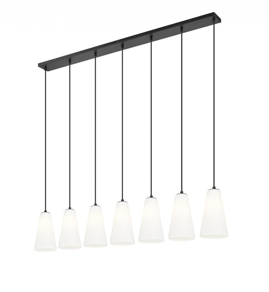 Enjoy the generous size and superb design of a modern seven-light linear chandelier. Ideally designed for a kitchen island or dining table, its sleek profile is enhanced with fluted shades, delicately elongated and crafted in frosted glass for beautiful illumination. With a matte black finish, its the perfect complement for sophisticated but approachable decor.