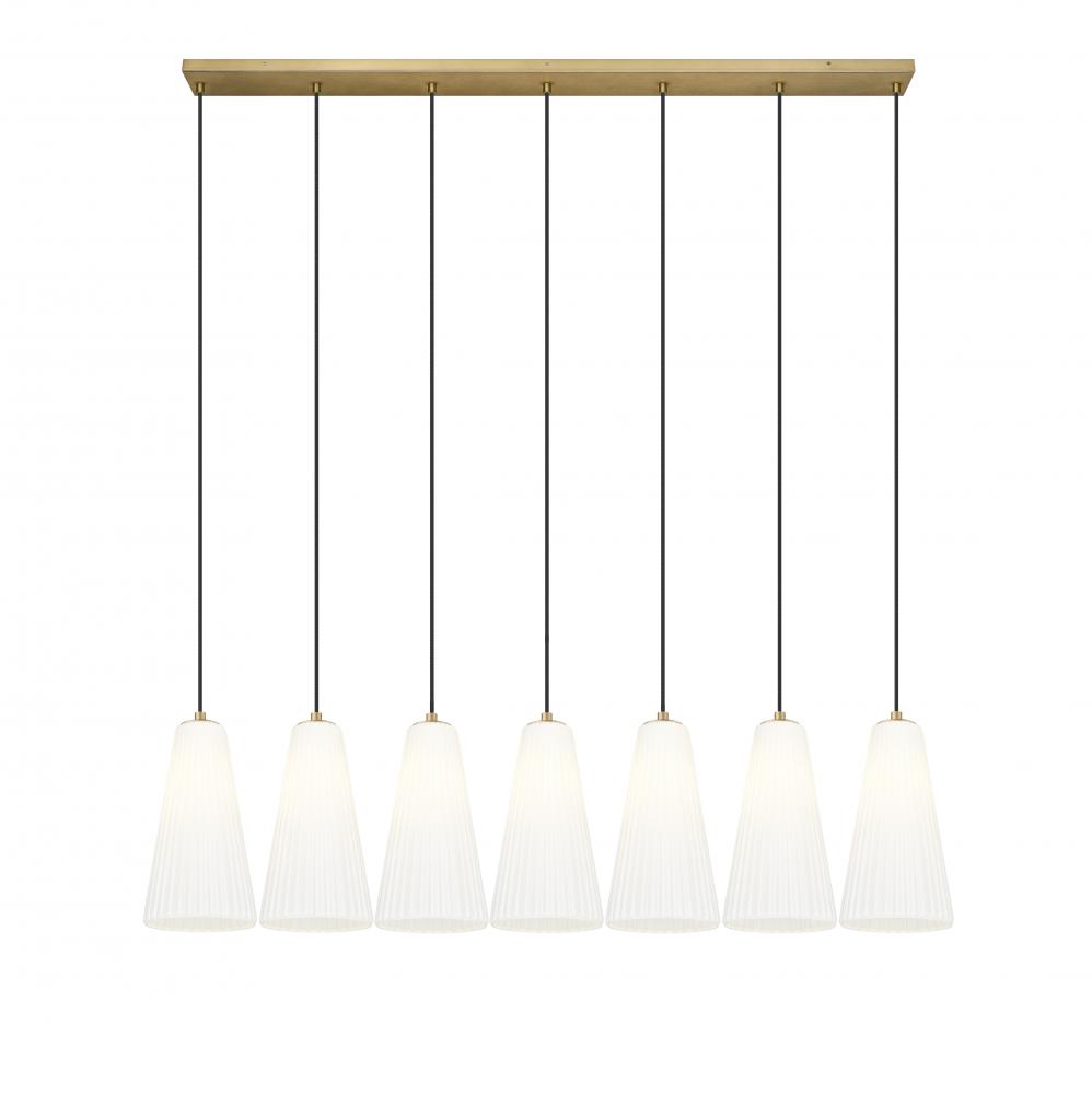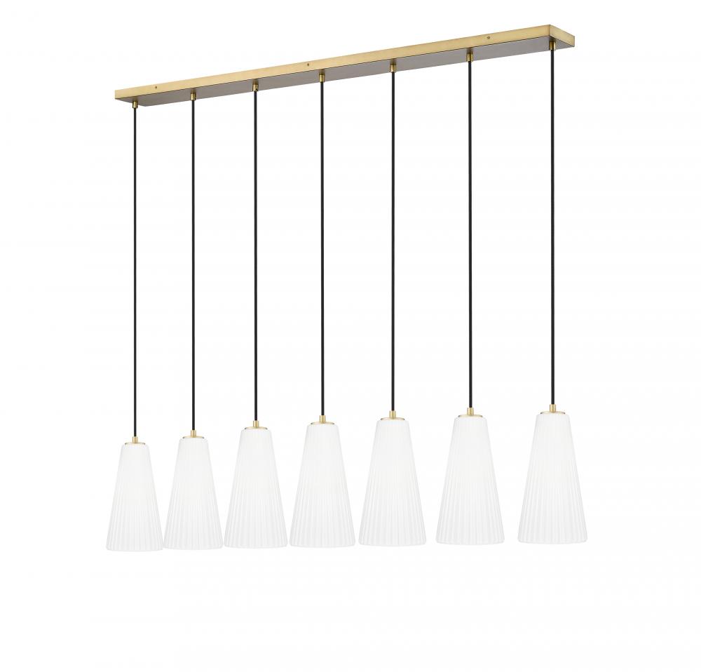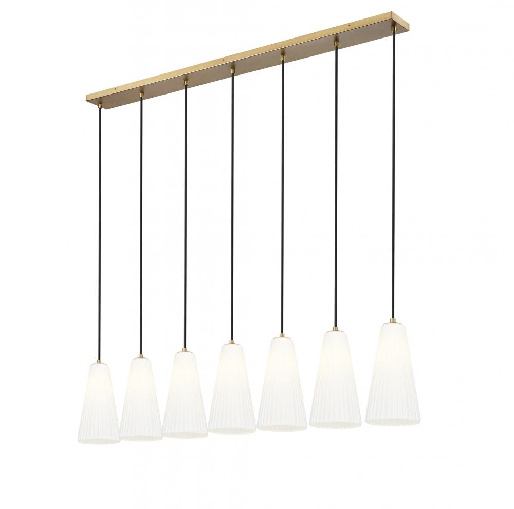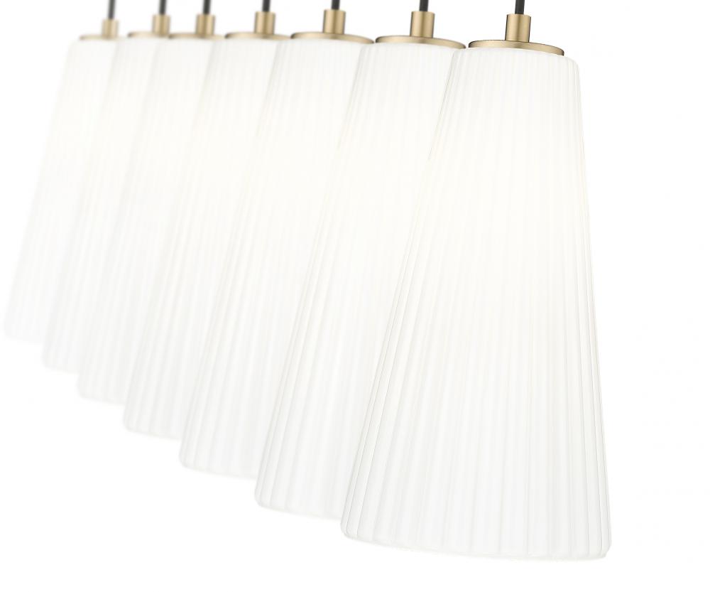 Enhance your gaming table or kitchen island with the generous size and superb sophistication of a modern seven-light linear chandelier. Its sleek silhouette is enhanced with a modern gold finish canopy paired with frosted glass shades that ensure soft, diffused illumination. Delicate fluting is a sophisticated choice, instantly elevating surrounding decor in your kitchen or dining room.