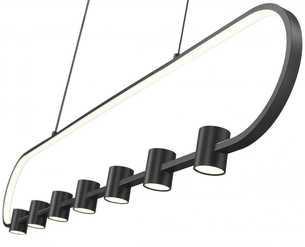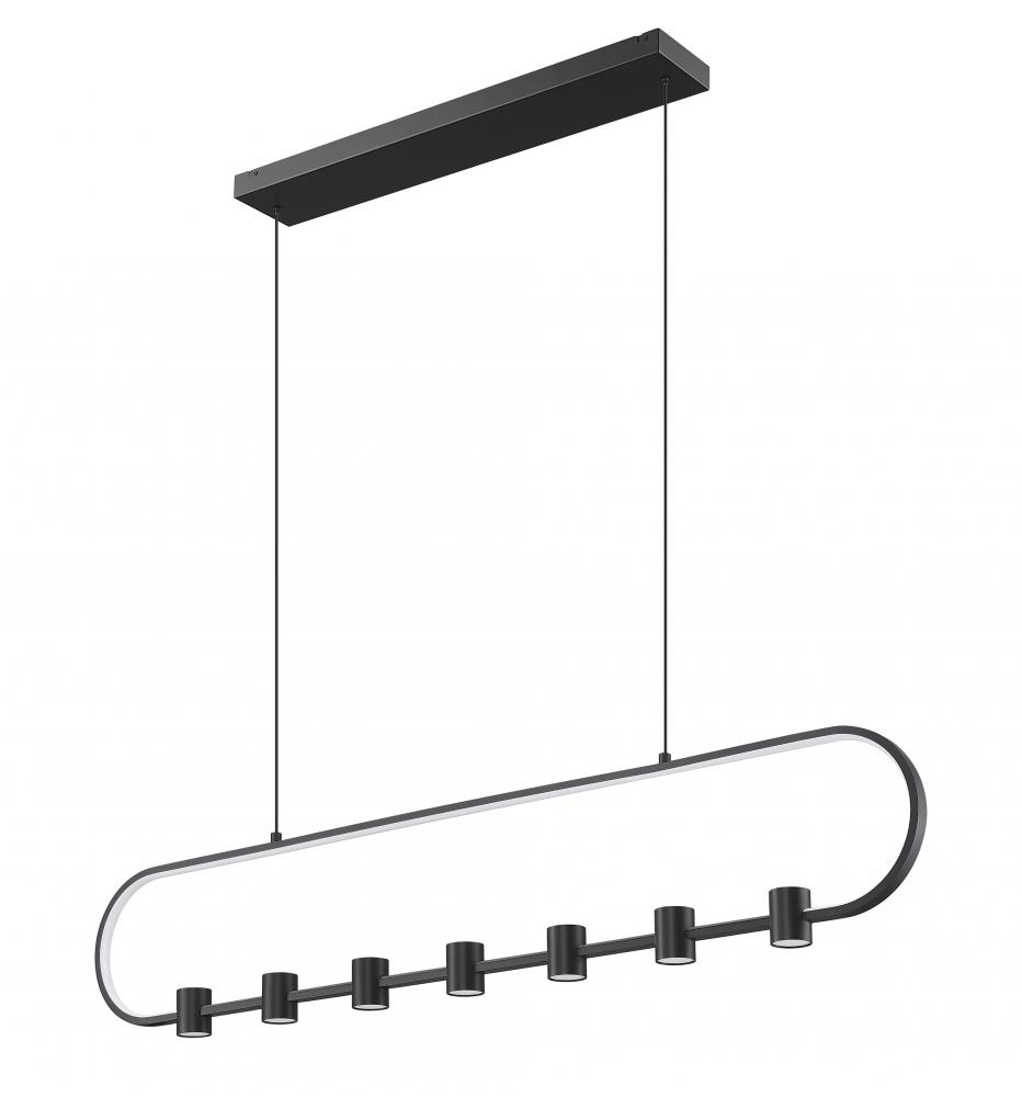 Black matte aluminum begins a design journey leading to a festive, charming look in lighting as this seven-light LED chandelier fulfills multiple functions. Highlight island venues and other horizontal settings with an open metalwork motif beginning with an airy oval body lined with an acrylic diffuser. Cylinder elements finish a crafty style, as LED lighting dims to varying illumination levels and creates custom mood lighting.