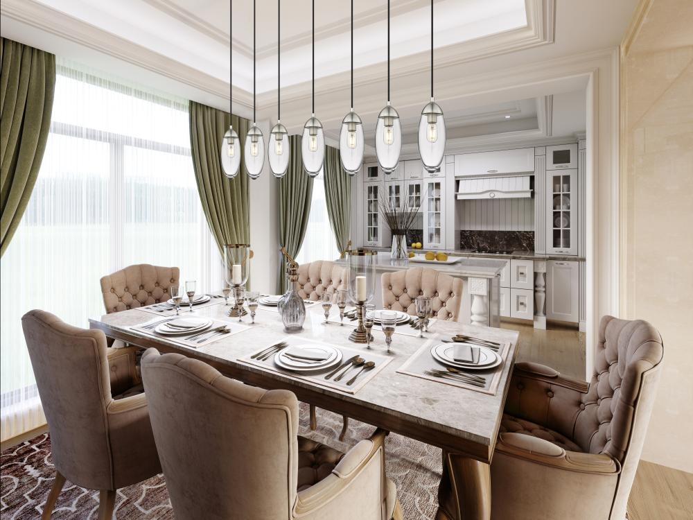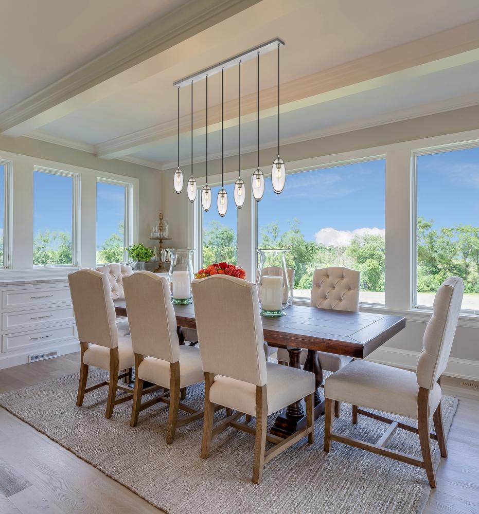 Customize a modern interior design scheme lighting suited to sleek elegance. A careful arrangement of delicate glass teardrop shades forms a minimalist silhouette with maximal impact as this seven-light chandelier becomes an expression of sophistication in a contemporary setting. Placed over an island, dining ensemble, or living area, this fixture with a brushed nickel finish metal canopy offers a sought-after mix of organic and gallery-inspired flavor.