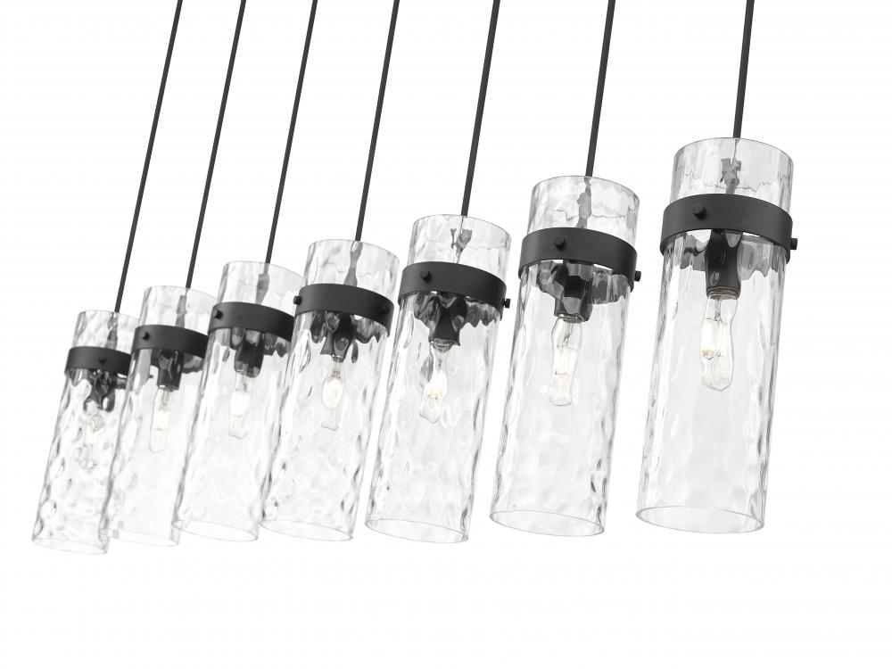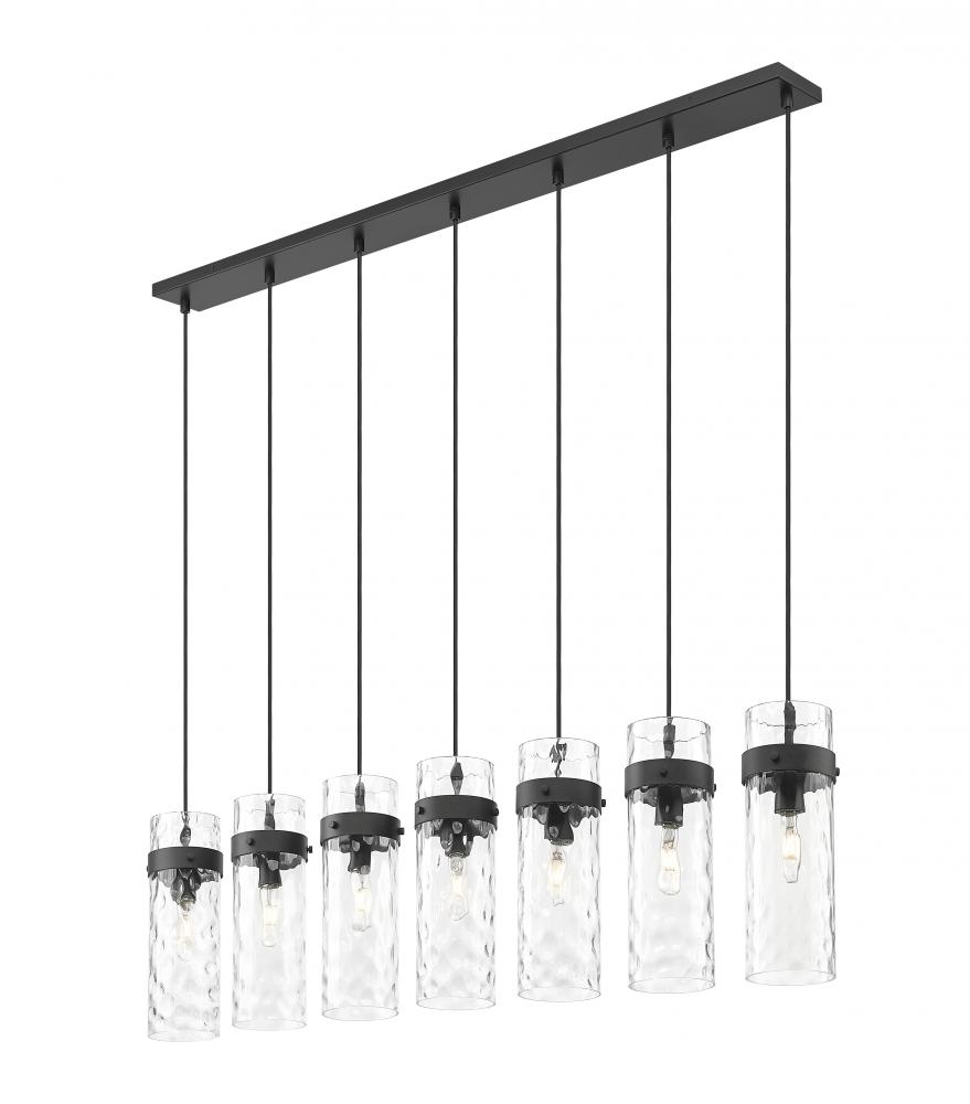 Superb opulence radiates from a modern seven-light linear chandelier. In matte black, it delivers impressive depth and contrast over a kitchen island or dining table, offering clear water glass shades and distinctive metal collars for a clean, precise look and feel. Braided cord completes the look to perfection.