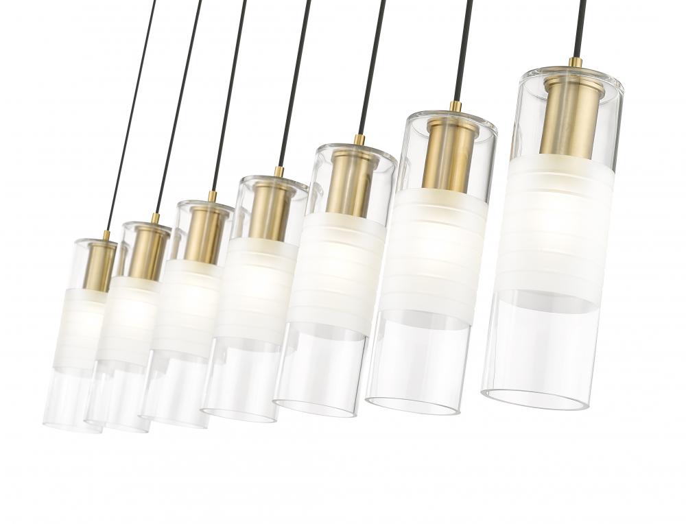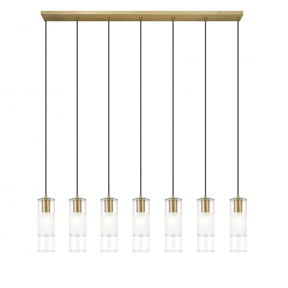 Instill a refined sensibility over a kitchen island or dining table with a modern seven-light linear chandelier. Impeccably designed with artisan clear and frosted glass shades and robust housings, the chandelier features a long, slim canopy and a rich modern gold finish. Each light suspends from a covered in braided cloth, lending impeccable tailoring and attention to detail to this superb fixture.