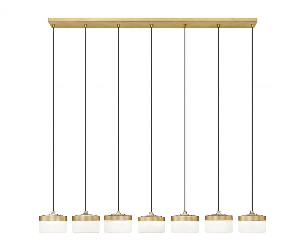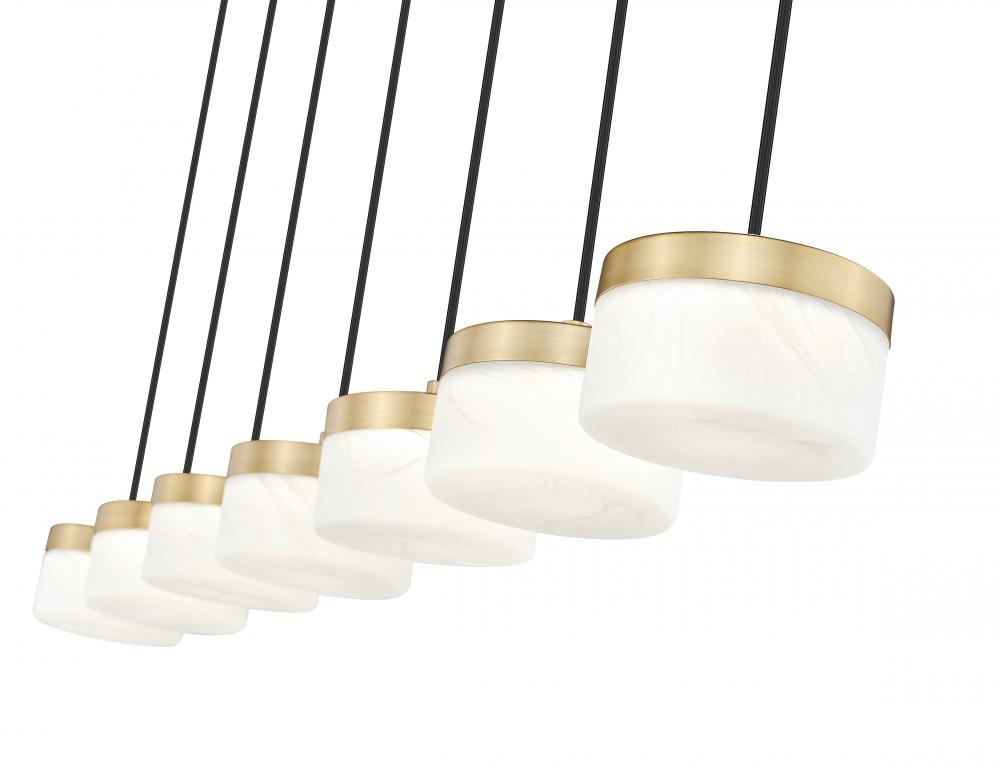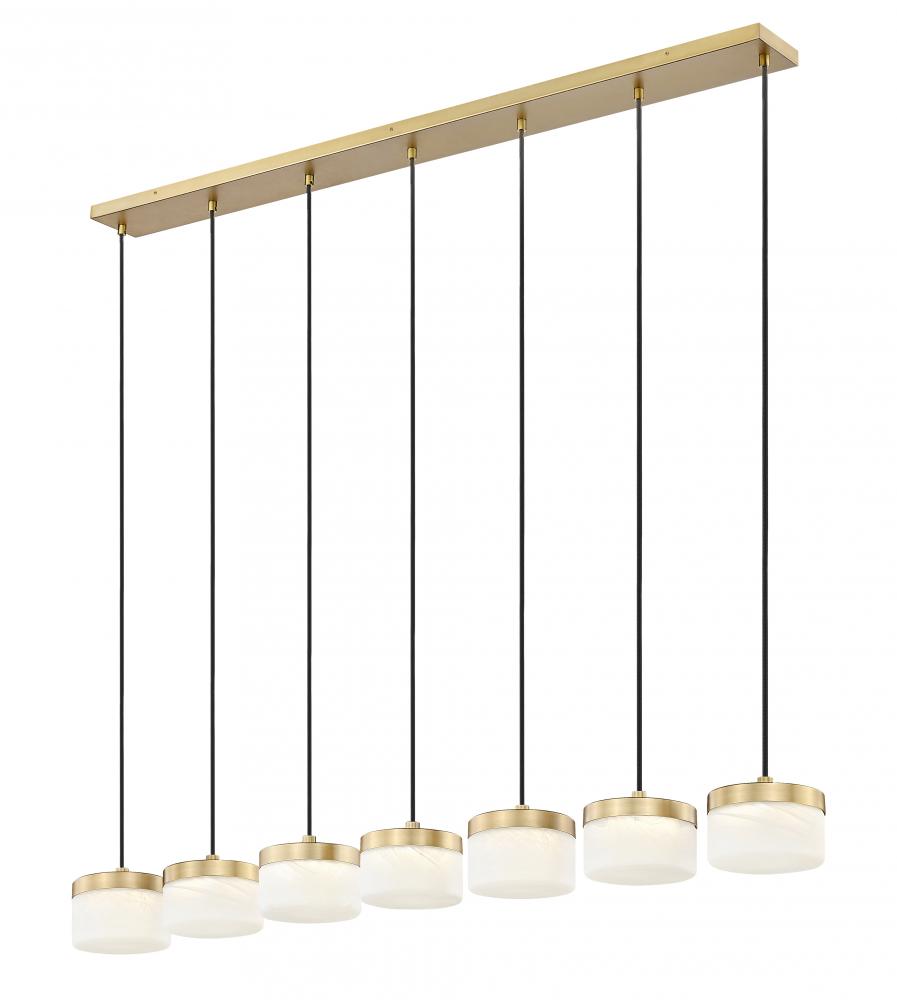 Along a warm satin rail, this modern gold 7-light linear LED chandelier stretches gracefully above the table, its slender cords and frosted cloud shades creating a refined band of light that feels both modern and welcoming. When dimmed for late-night drinks or brunch on a sleepy weekend, it settles into a soft glow that gives the whole room an easy, friendly atmosphere.