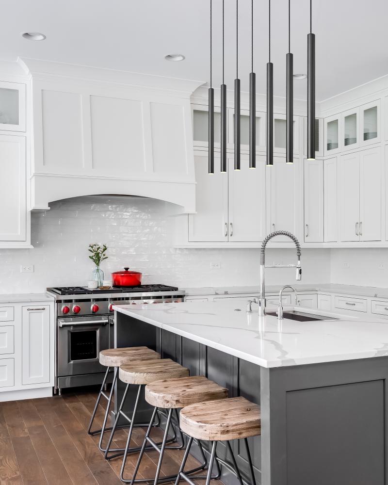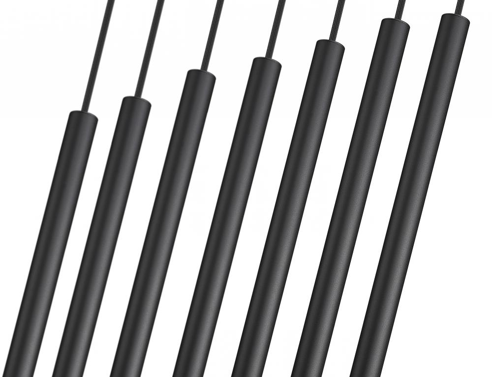 Matte black creates bold contrast and depth for this modern seven-light linear silhouette. Its elongated design is paired with slim shades, each housing integrated LEDs that are both dimmable and energy efficient. Add this striking fixture over a kitchen island or dining table to create inviting, impeccable illumination.