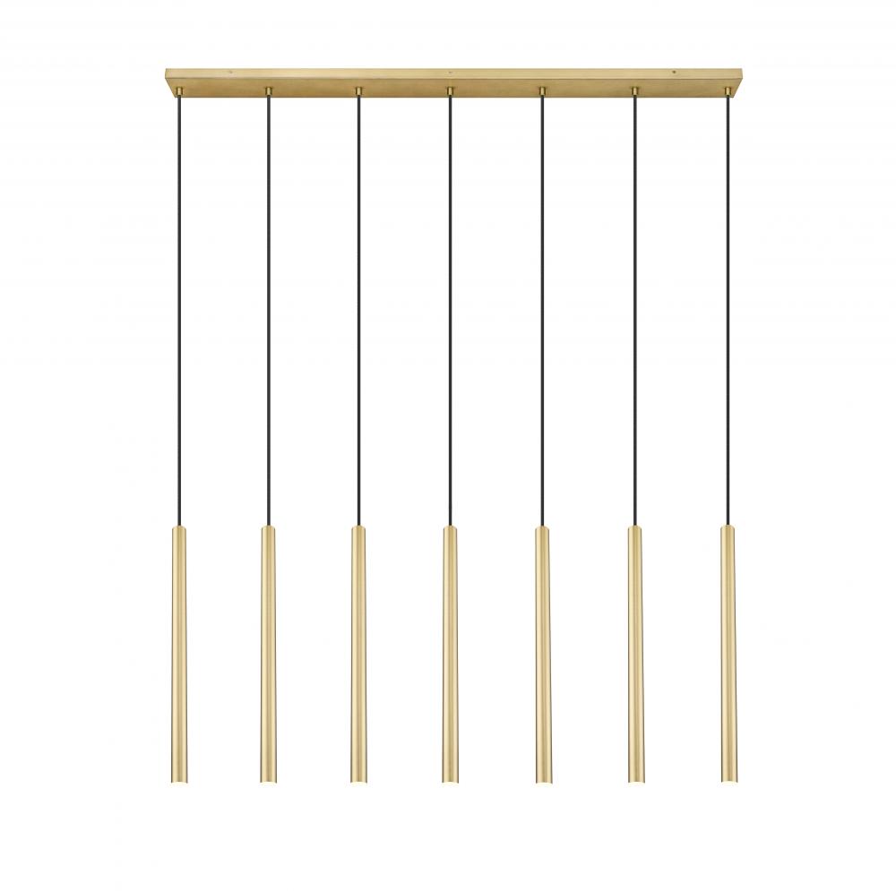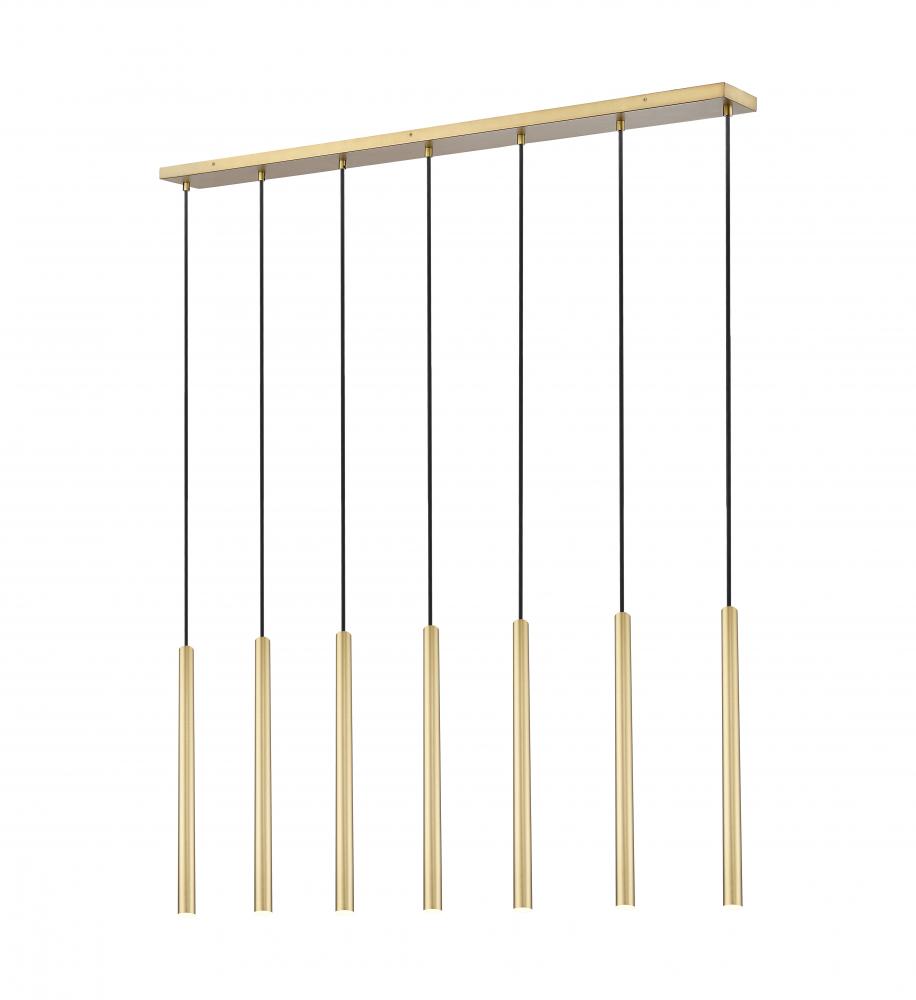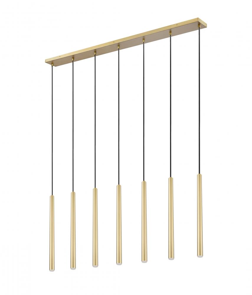 Infused with the sophisticated warmth of a modern gold finish, this contemporary seven-light linear chandelier adds an inviting ambiance over a dining table or kitchen island. It boasts an elongated silhouette paired with long, slim shades, casting welcoming LED illumination thats both dimmable and energy efficient.