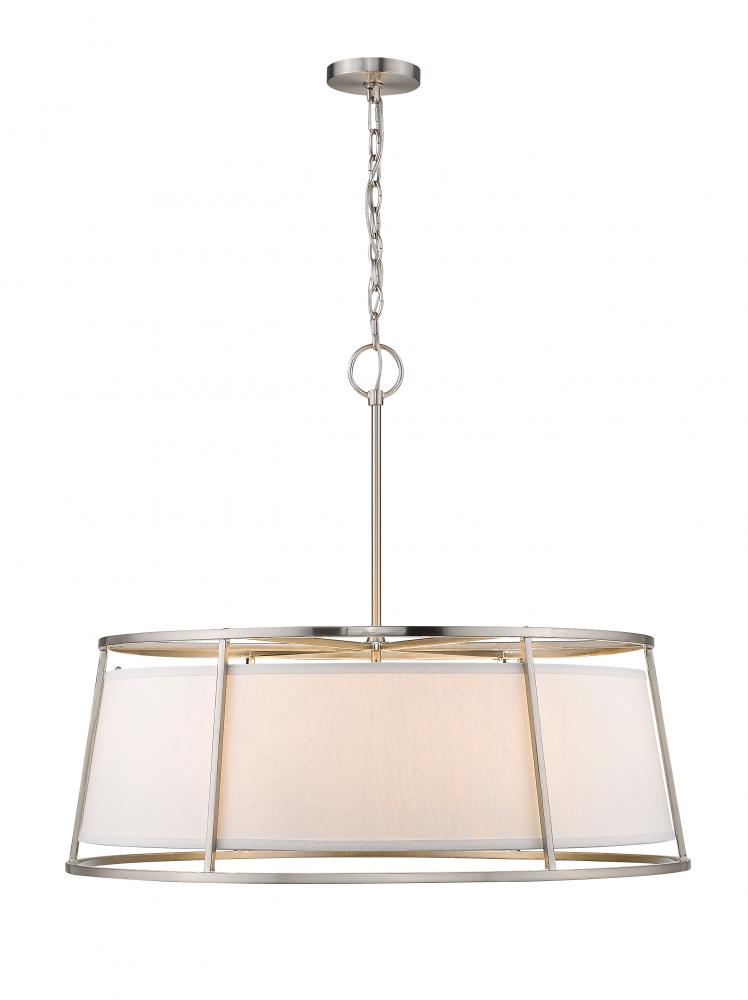 Illuminate your living space with the alluring glow of this elegant, eight-light pendant. With a versatile design that works well in almost any room, this sophisticated fixture blends a brushed nickel frame with a soft, white shade for beautiful ambiance.