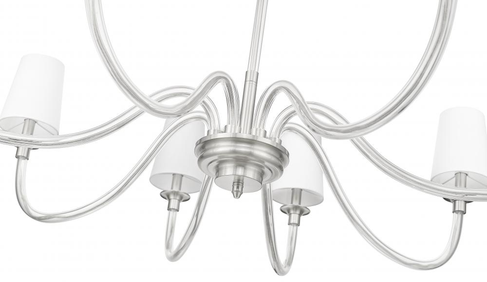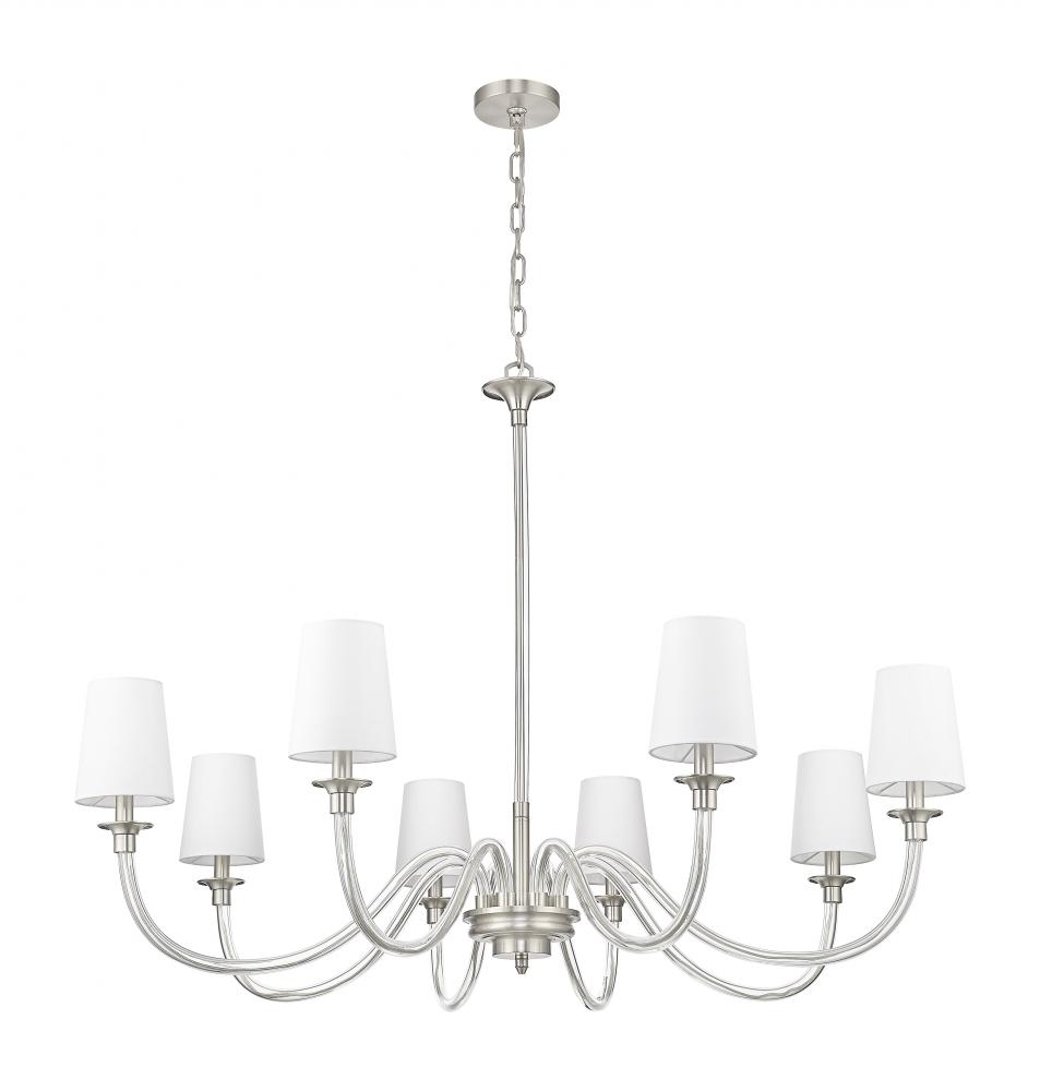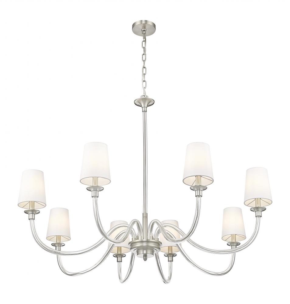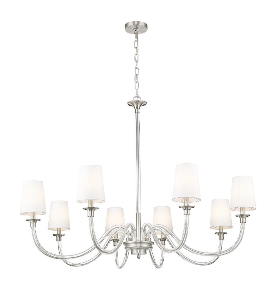 Swooping arms of delicate glass create elegance for this modern eight-light chandelier, which blends pre-war classical elegance with updated aesthetics. Tapering white fabric shades ensure soft illumination, while a brushed nickel finish gleams gracefully over your living and dining spaces.