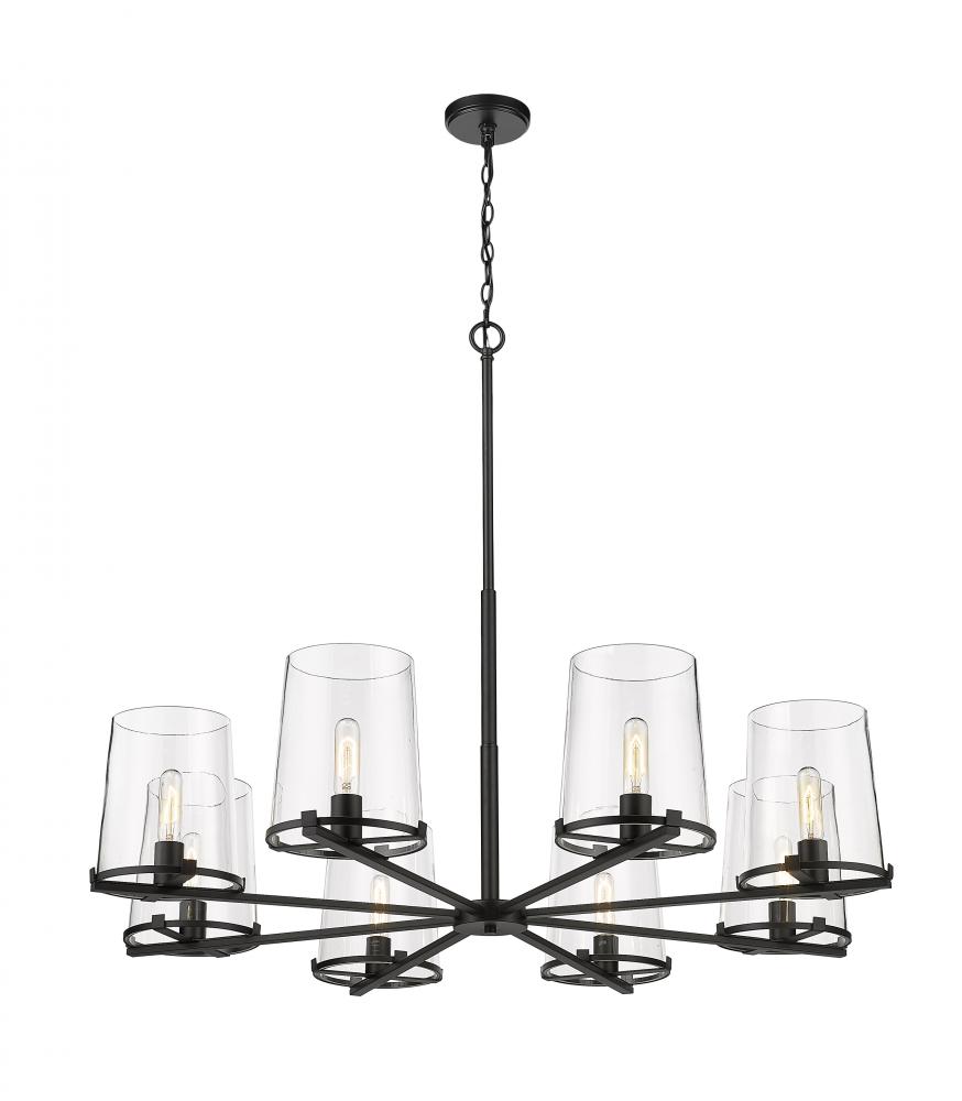 A virtual ring of elegance satisfies discerning tastes when the elegant Callista eight-light chandelier frames a dining ensemble, main living area, or entryway in a transitional to modern setting. This exceptional fixture creates a charming round silhouette formed with a handcrafted matte black finish steel frame and its wagon wheel silhouette, delivering a hint of industrial vibes. Tapered, clear glass shades filter ambient lighting and wrap up a list of high-energy yet easy-living features designed to impress.