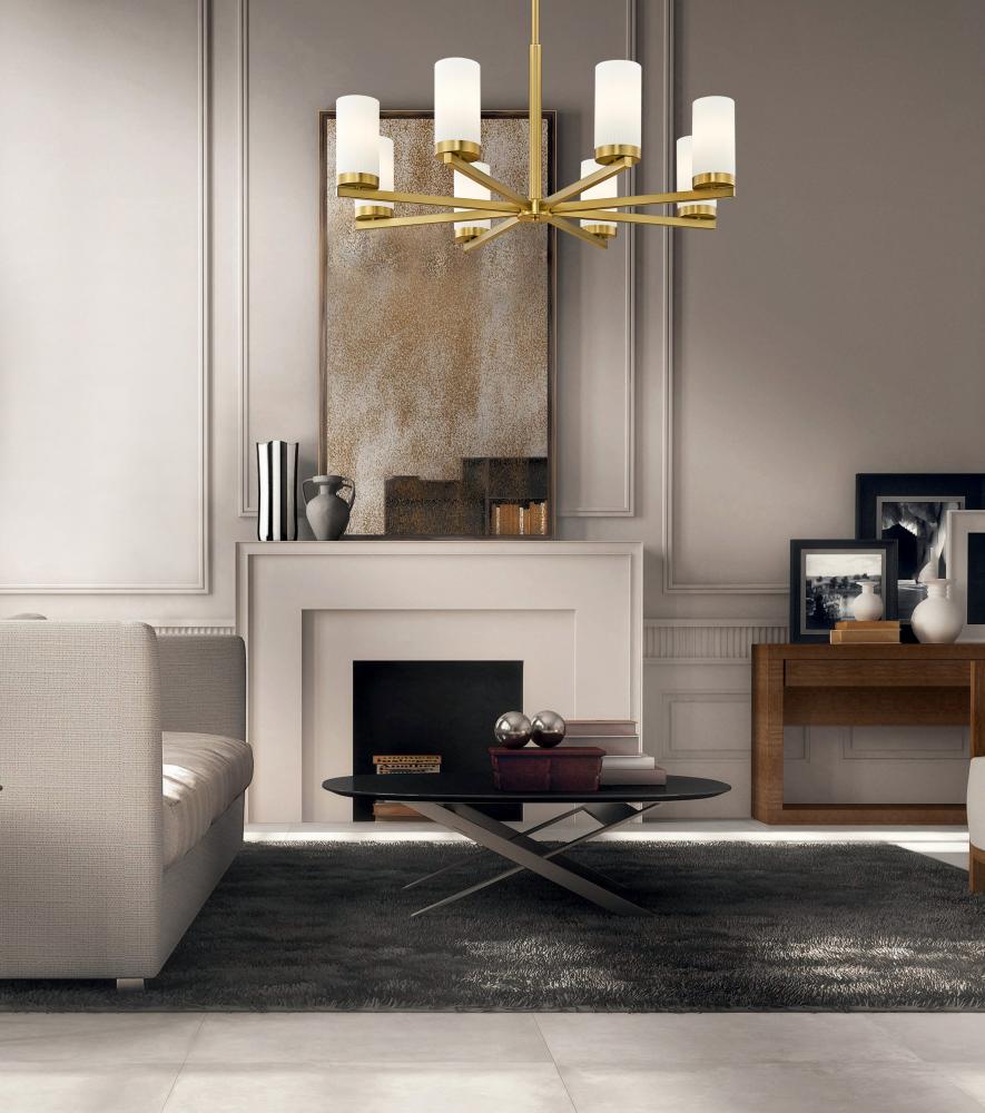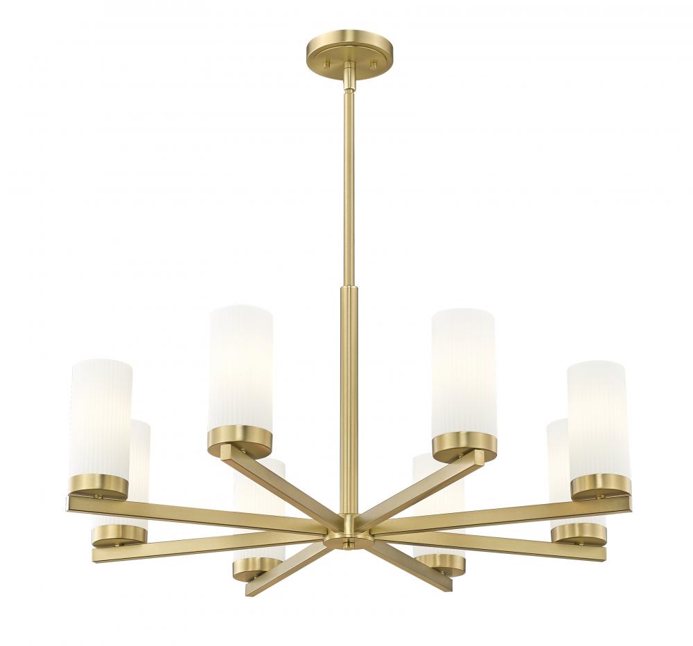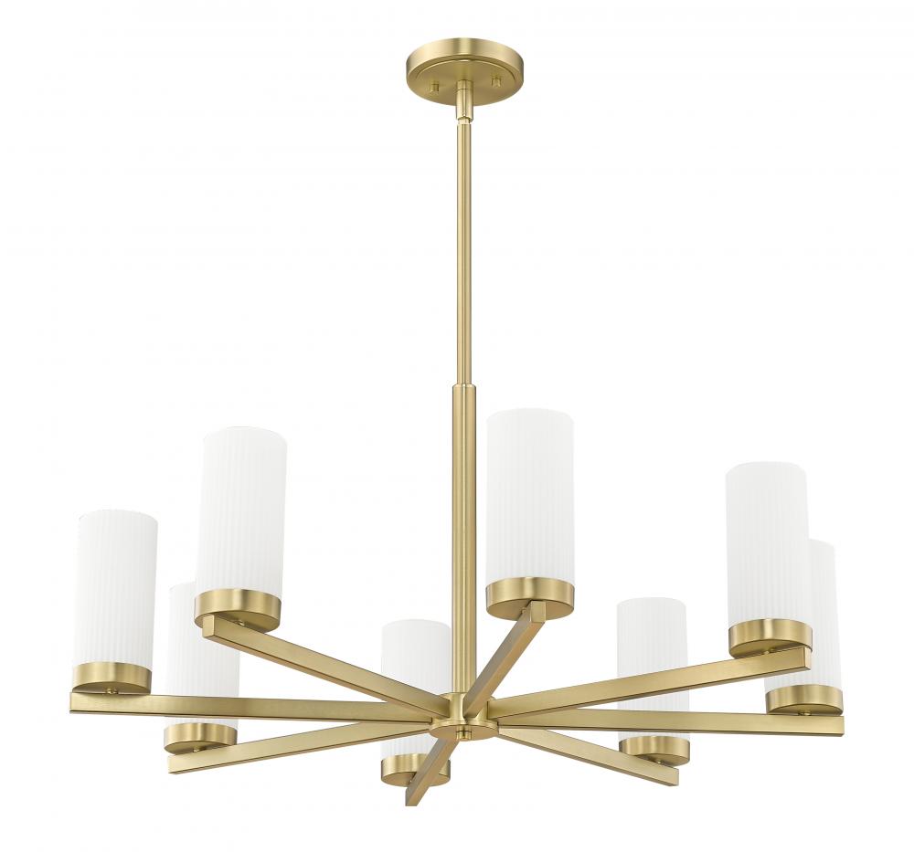 Set a soothing but sophisticated tone over your entry or dining table with a modern eight-light chandelier with a round silhouette and radial arms. It casts beautiful illumination with cylindrical shades in frosted white glass, offering a sense of balance against a warm modern gold finish over steel construction.