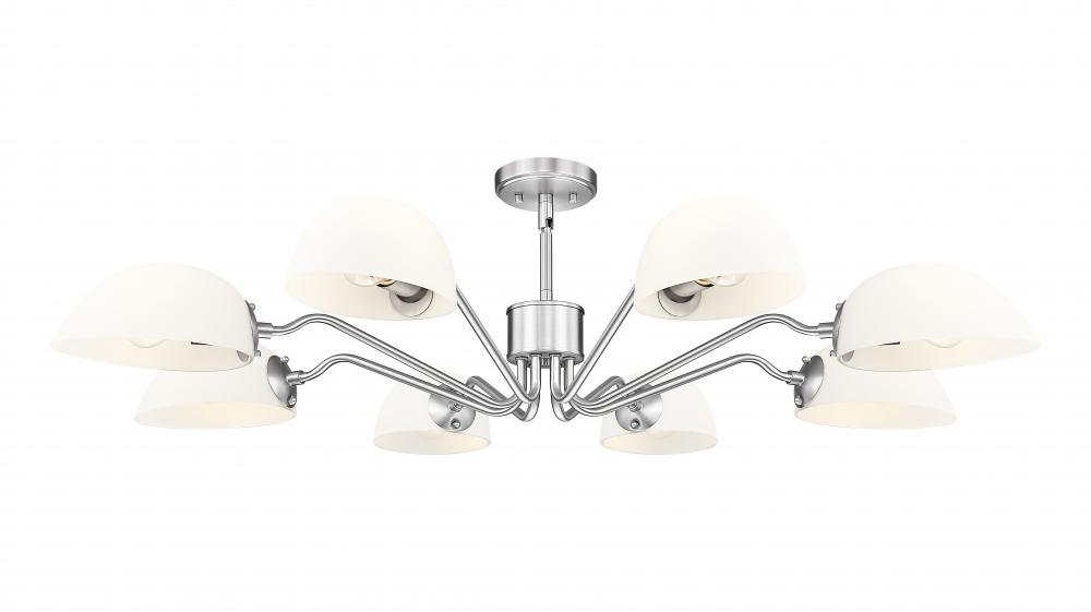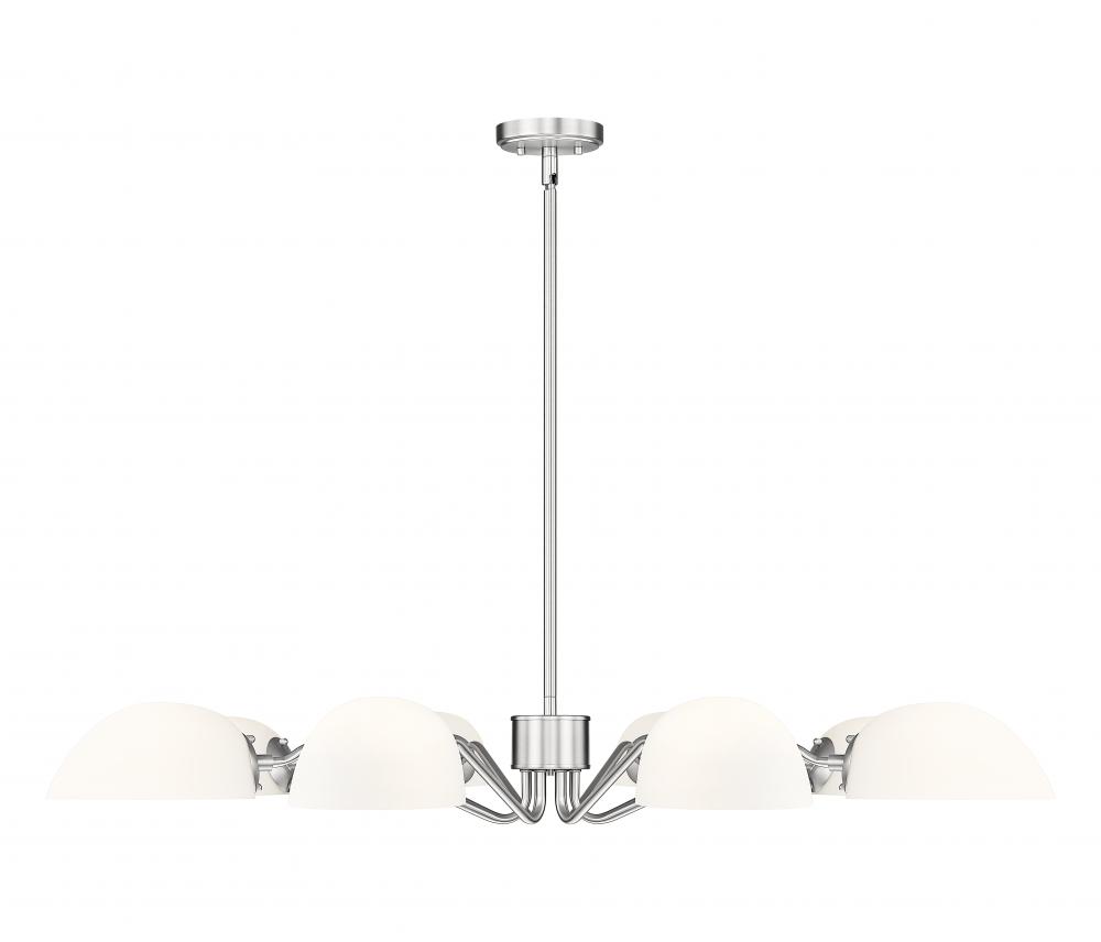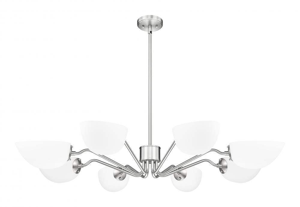 Light up a large space with the generous size of this modern eight-light chandelier. Delicately curves arms add personality, while reversible domed shades cast soft, inviting illumination either up or down. A brushed nickel finish is a timeless touch that complements in virtually any space.
