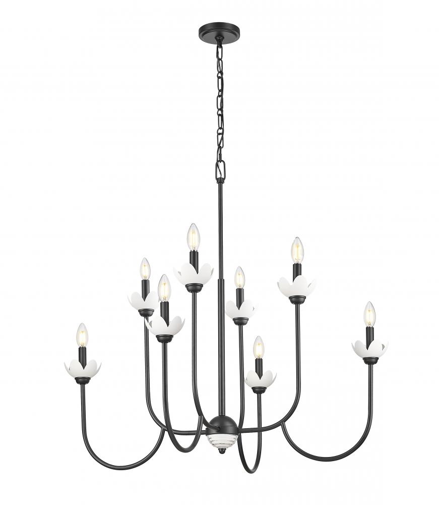 Delicate floral bobeches, in interchangeable white metal and clear glass, highlight this transitional eight-light chandelier. Perfect over a foyer or in your dining room, it offers a clean, fresh ambiance with a center sphere of clear glass and a matte black finish that adds contrast and depth. Curvy arms create a two-tiered silhouette and ensure an inviting ambiance in any setting.
