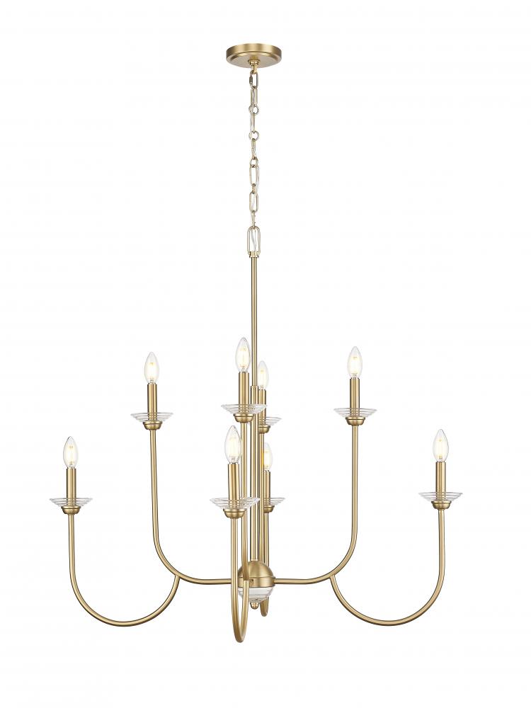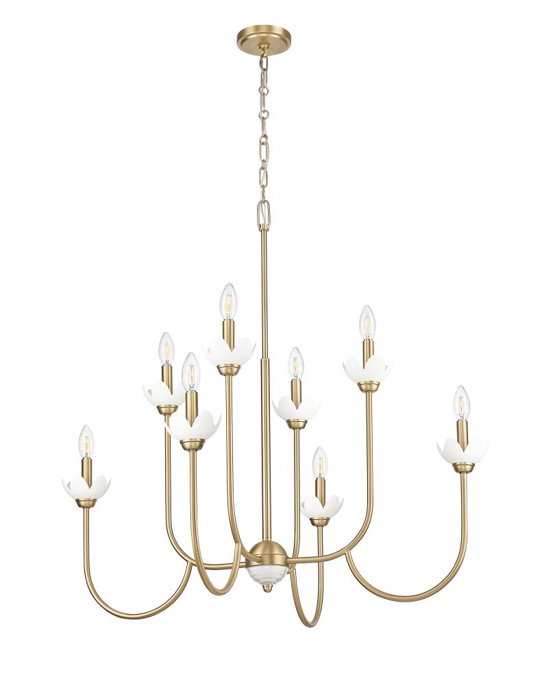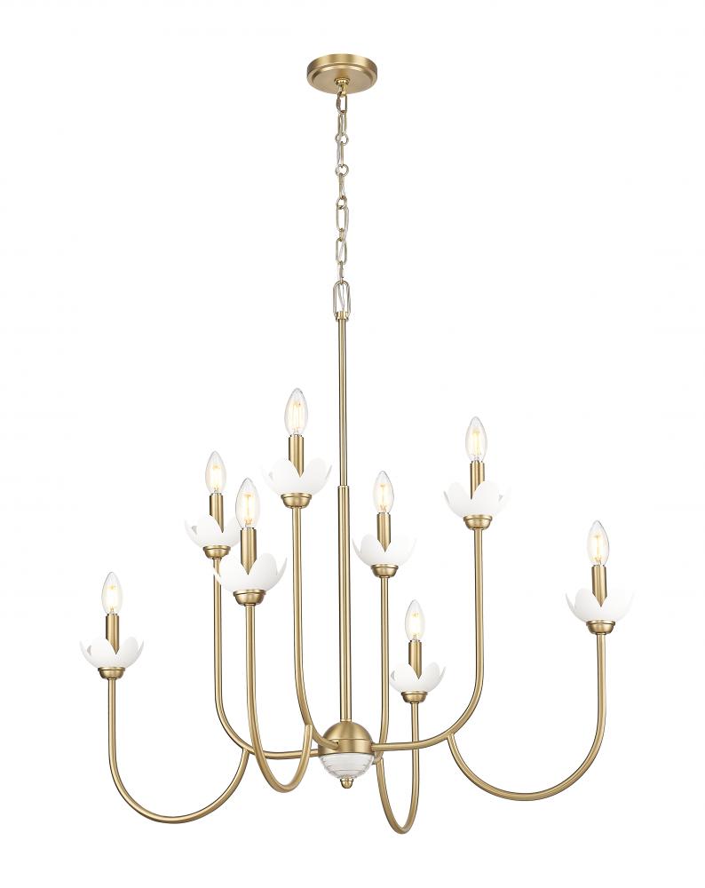 Dive into vintage charm with the floral details and inviting modern gold finish featured on this transitional eight-light chandelier. A dazzling choice over a dining table or foyer, it features delicately curves arms and interchangeable bobeches that resemble flower petals, adding unmistakable feminine charm.