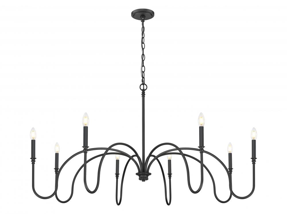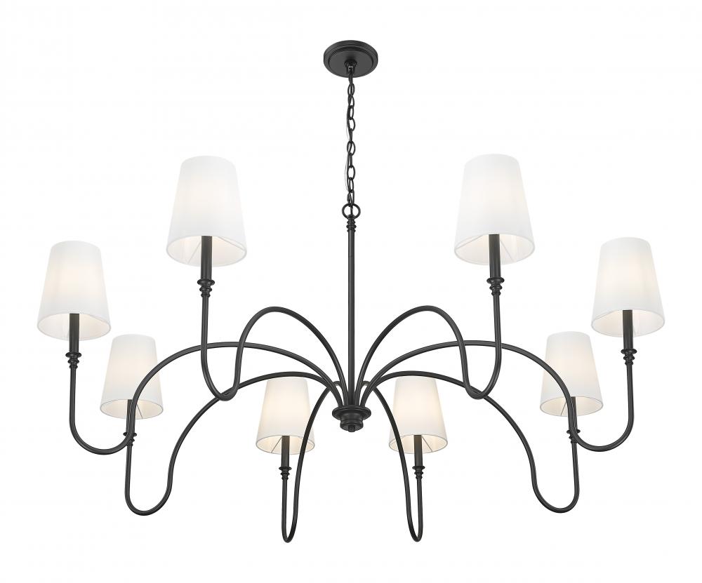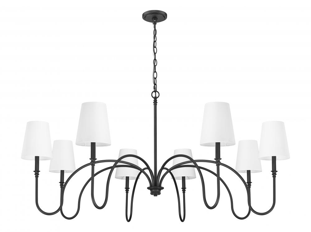 Dramatically curved arms create an open-air look to this eight-light chandelier that flatters large living and dining spaces. Bold matte black finish steel and pale linen shades bring custom contrast to a fixture with romantic silhouetting. Dimming features allow for mood lighting and time-of-day illumination needs.