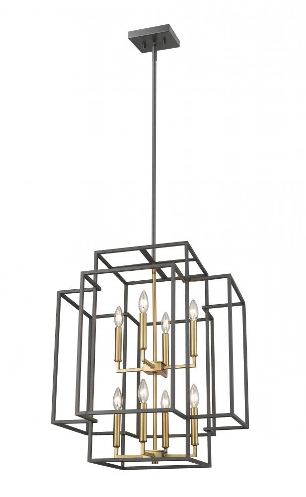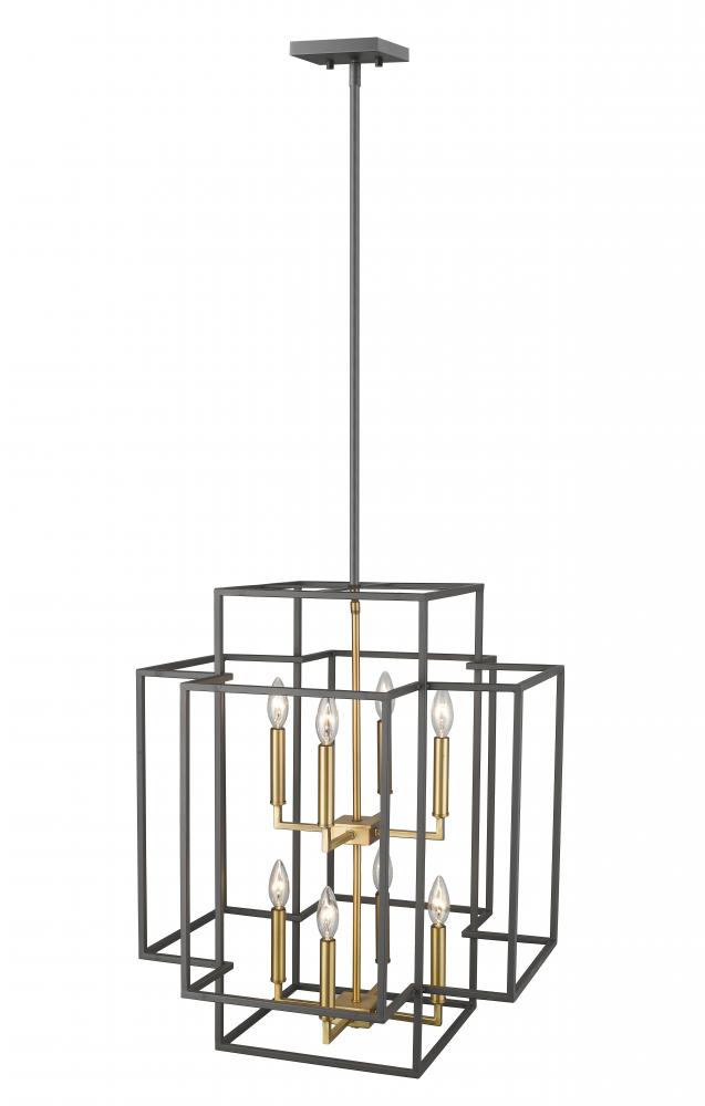 Choose this stunning eight-light pendant as a primary light source for a modern space. A blend of warm bronze and olde brass finish steel highlights a delightful blend of linear architecture and soft, romantic candelabra bulb bases, creating a versatile and artistic mood.