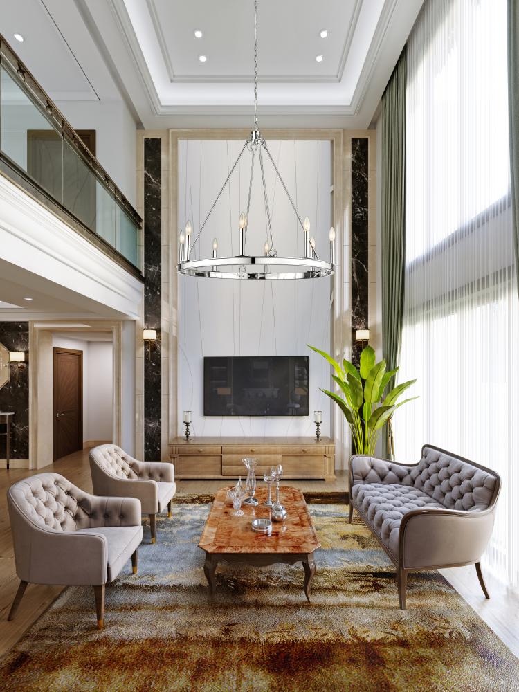 Committed to an extraordinary style impact, this traditional eight-light chandelier delivers on a theatrical motif with gleaming radiance. A classic ring silhouette features construction of polished nickel finish steel, adding versatility to its long list of attributes. Classic round silhouetting suggests a palace theme that speaks to sparkling expressive style in this chandelier offering charming, romantic candelabra bulb mounts.
