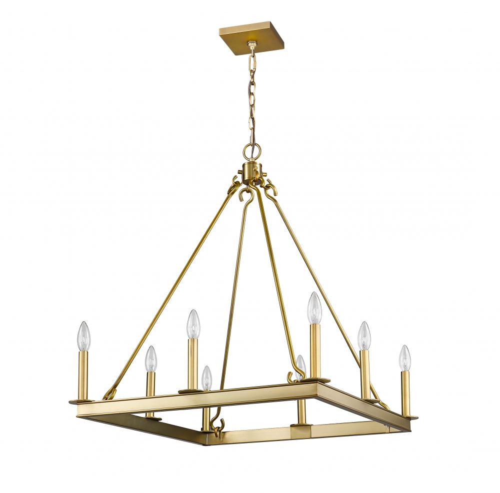 Enjoy the stylish design and tones of this eight-light chandelier for your home. Its fashioned in a lustrous olde brass finish with the candle-inspired lights in a large bold square design. Itll instantly energize the ambiance in your dining room, foyer, or kitchen.