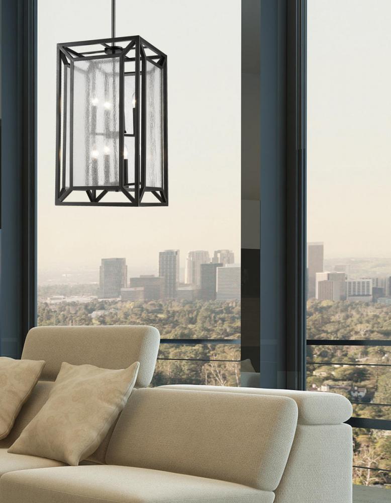 Straight lines and seedy glass create an interesting transitional design. Rich bronze hardware and the tall candles complete the look. Multiple sizes and segmented rods add to the versatility of this collection.