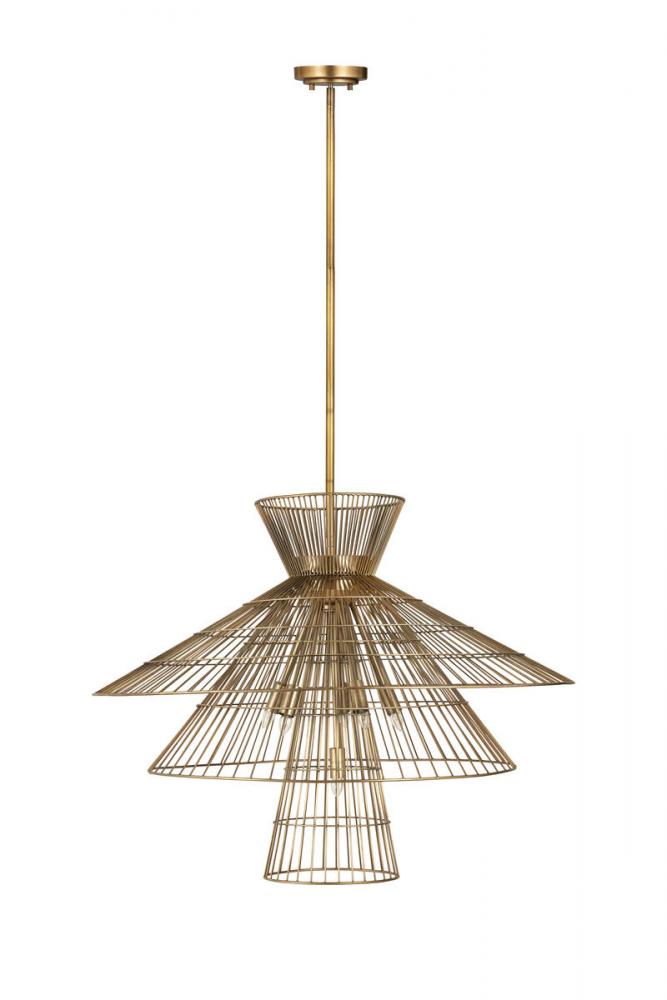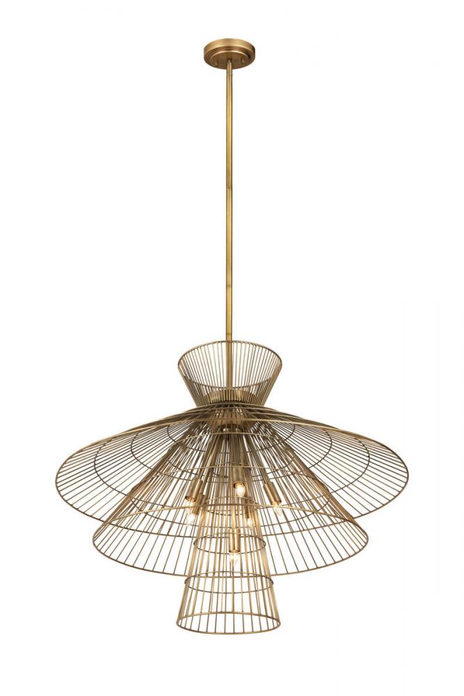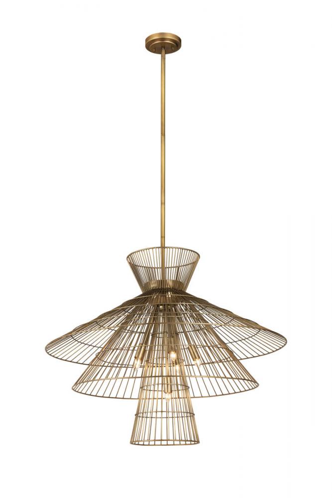 Change up modern d?cor with a light fixture that delivers cool personality and a mix of modern and industrial design motifs. This eight-light pendant from the Alito collection creates a stir in any space with a multi-tiered geometric arrangement of charming wired open conical shades. With a warm rubbed brass finish body, down rod, and canopy, this pendant tells a story in a custom, upbeat dining space, entryway, or main living area.