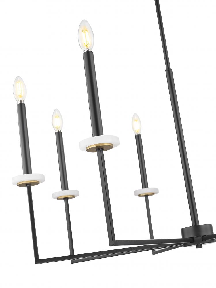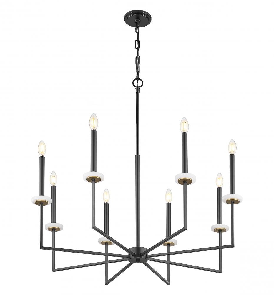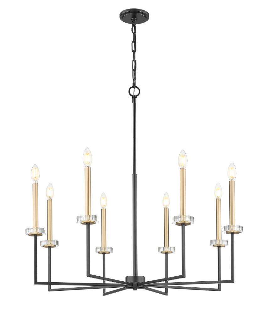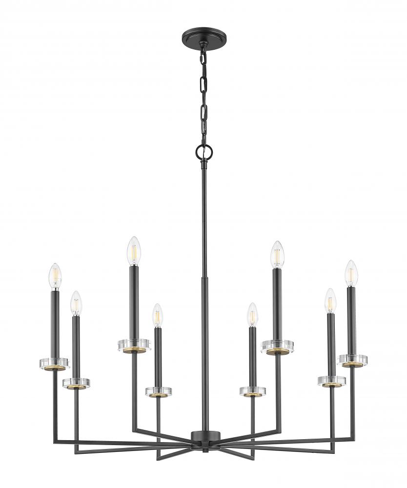 Dramatic design with a bit of softening creates a sophisticated look for this eight-light chandelier, a timeless fixture with both linear and romantic charm. Bold matte black steel construction delivers an expressive look for dining rooms and foyers, with elegant torch sleeves and candelabra bulb bases invoking a village motif, and organic boboches adding final touches. Varying levels of illumination through dimming functionality creates welcomed mood lighting.